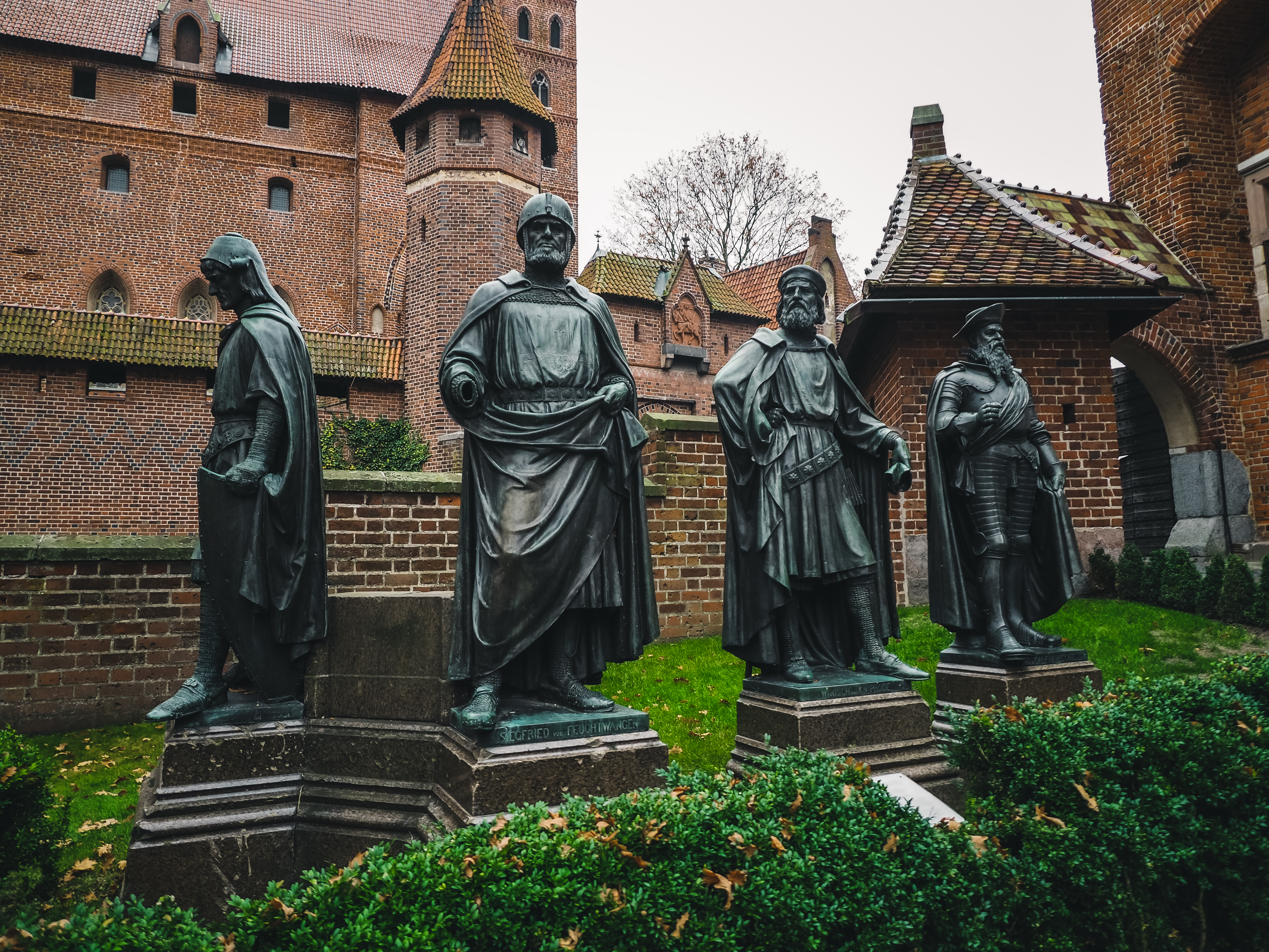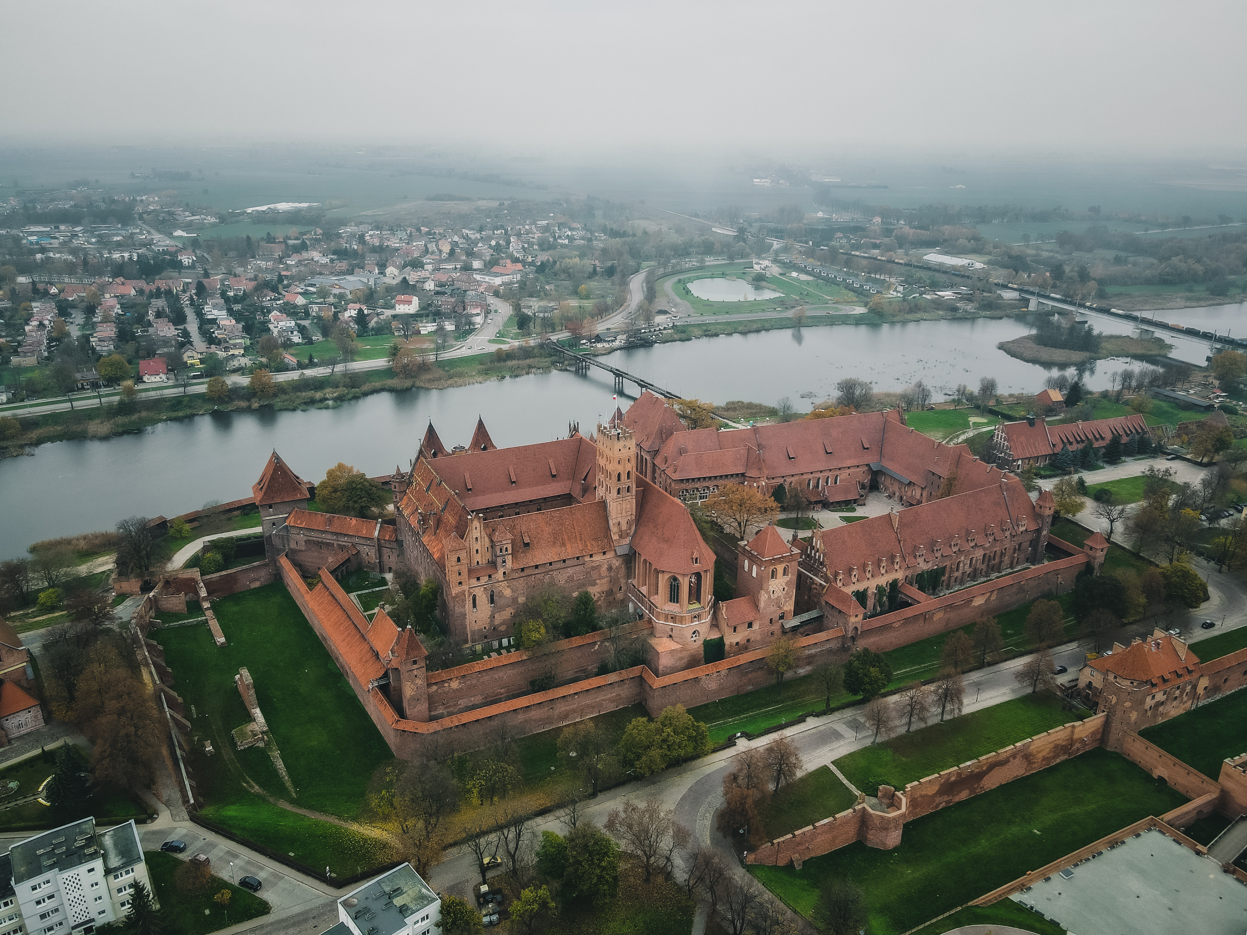 Agréablement surpris par la richesse de cette ville, nous repartons reboostés sur la route en direction de Malbork. Nous trouvons un emplacement dans un camping officiellement fermé qui nous accueille à bras ouverts au pied du château. Nous sommes à nouveau plongés dans l’histoire médiévale de la Pologne. Au cœur de la capitale de l’état teuton de 1309 à 1457, le siège des Grands Maîtres de l’Ordre des Chevaliers Teutoniques est la plus grande forteresse médiévale d’Europe. Bien que nous ne puissions pas visiter les salles, nous nous mettons un instant dans la peau de chevaliers pour parcourir les remparts de briques rouges superbement bien restaurés selon les plans conservés dans les archives du château tout au long de son histoire. Un vol en drone nous donne un aperçu de la complexité de cet ensemble d’architecture défensive d’exception.