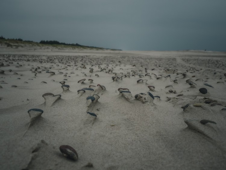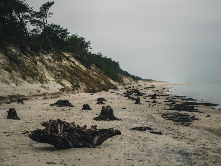 Nous longeons la côte de la Mer Baltique – eh oui nous avions oublié que la Pologne avait une frontière maritime – jusqu’à Léba, aux portes du parc naturel de Slowinski sur les bords du lac Lebsko. La route de nuit n’est pas facile, les polonais roulent très vite sur un bitume plein de trous lorsque nous quittons les axes principaux. Nous nous garons sur le parking de la réserve naturelle, nous sommes tous seuls. Au moment de nous coucher, il nous semble entendre des sabots inspecter Derful. Nous ne serons pas quel animal est venu nous rendre visite.