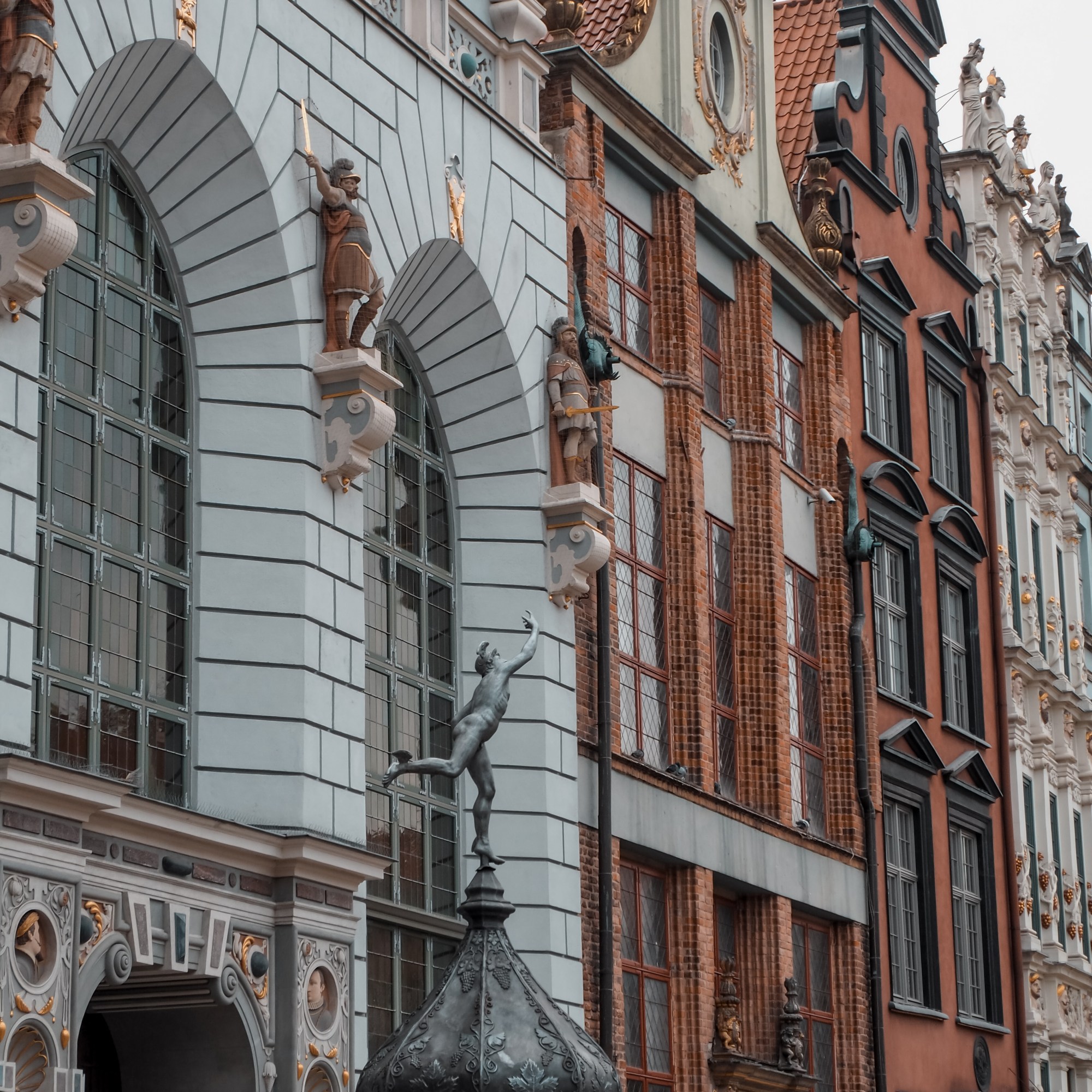 Nous rejoignons ensuite la rue principale Ulica Dluga (la rue Longue) et la place Dlugi Targ (place du Long-Marché) qui forment la Voie Royale. Les maisons sont richement décorées et témoignent de l’âge d’or de Gdansk, à l’image de l’Hôtel de Ville. Sur la place du Long-Marché, la fontaine de Neptune, œuvre de l’architecte flamand Abraham van den Blocke, rappelle les nombreux échanges qui existaient entre les différentes villes de la Hanse.