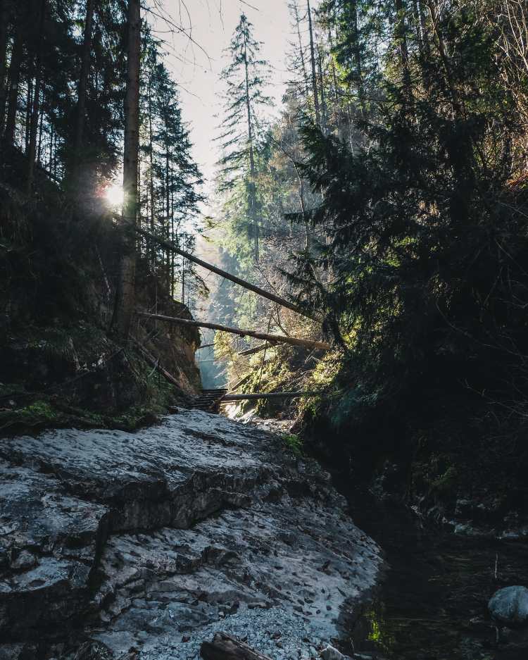 Le lendemain, nous partons à la découverte de ce fameux paradis. La Slovaquie invite à se reconnecter avec la nature et l’Etat œuvre largement en faveur de sa protection. L’entrée du camping débouche sur l’un des plus beaux sites de ce parc naturel : les Gorges de Sucha Bela. Nous remontons le cours d’eau à travers la forêt primitive. Les échelles, passerelles, marchepieds et autres chaînes donnent des airs de via-ferrata à notre aventure. Certains passages peuvent paraître impressionnants mais l’environnement est très sécurisé et nous permet de profiter de ce havre de paix. La lumière envoutante confirme le nom donné à cet espace préservé.