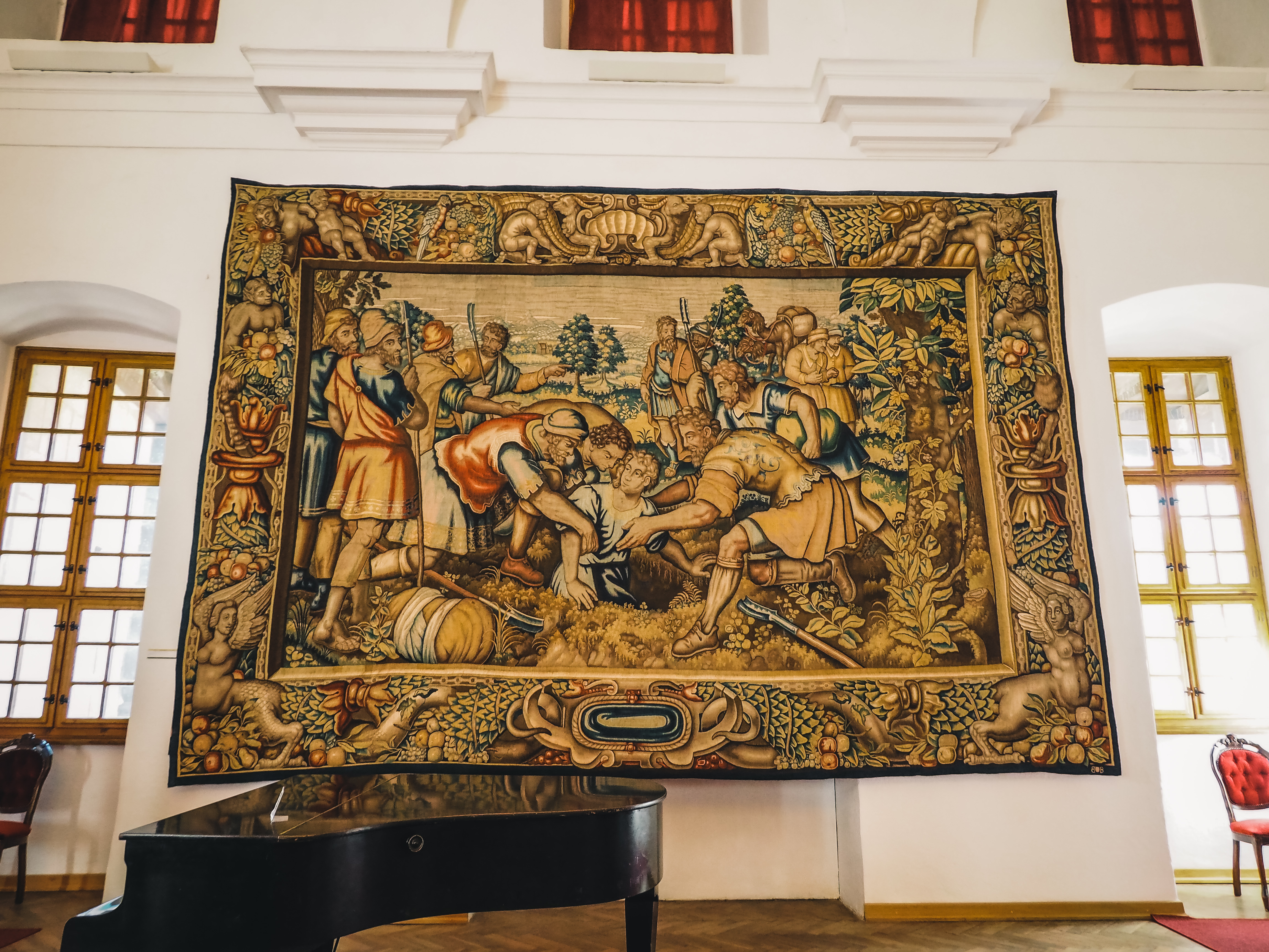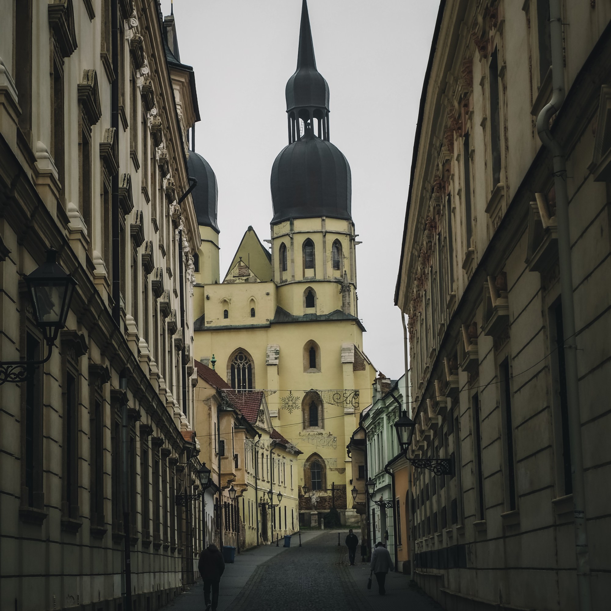 Nous quittons Bojnice pour nous rapprocher peu à peu de la capitale. Nous faisons un arrêt à Trnava. Surnommée la « Petite Rome », la ville ne compte pas moins de 11 églises et 2 synagogues. Trnava est au 13ème l’une des plus grandes villes du royaume de Hongrie et devient même l’archevêché de l’empire. Au 17ème siècle, son université jésuite conforte sa position dans le paysage européen avant son déclin à partir du 18ème siècle. Le très beau beffroi de 1574 permet d’observer l’architecture de la ville fortifiée. Malheureusement, nous n’avons pas la chance de visiter les nombreuses églises qui sont pour la plupart fermées aux visiteurs pour raisons sanitaires. Nous découvrons cependant une exposition de photographies d’artistes locaux dans l’ancienne synagogue rue de Halenarska. Le temps gris et le vent glacial nous poussent à trouver un endroit un peu au chaud. Dans la cour intérieure d’un des nombreux passages de la rue principale, nous trouvons un petit marché avec des spécialités locales. Nous goûtons au Meldinova chaud, un vin confectionné à partir de plantes et de miel. Nous accompagnons cela d’une autre spécialité : une sorte de pizza à la pâte frit et frottée à l’ail sur laquelle est ajouté du fromage râpé. Après ces petits délices, nous continuons notre visite au pied des remparts avant de retrouver Derful pour prendre la route de Bratislava.