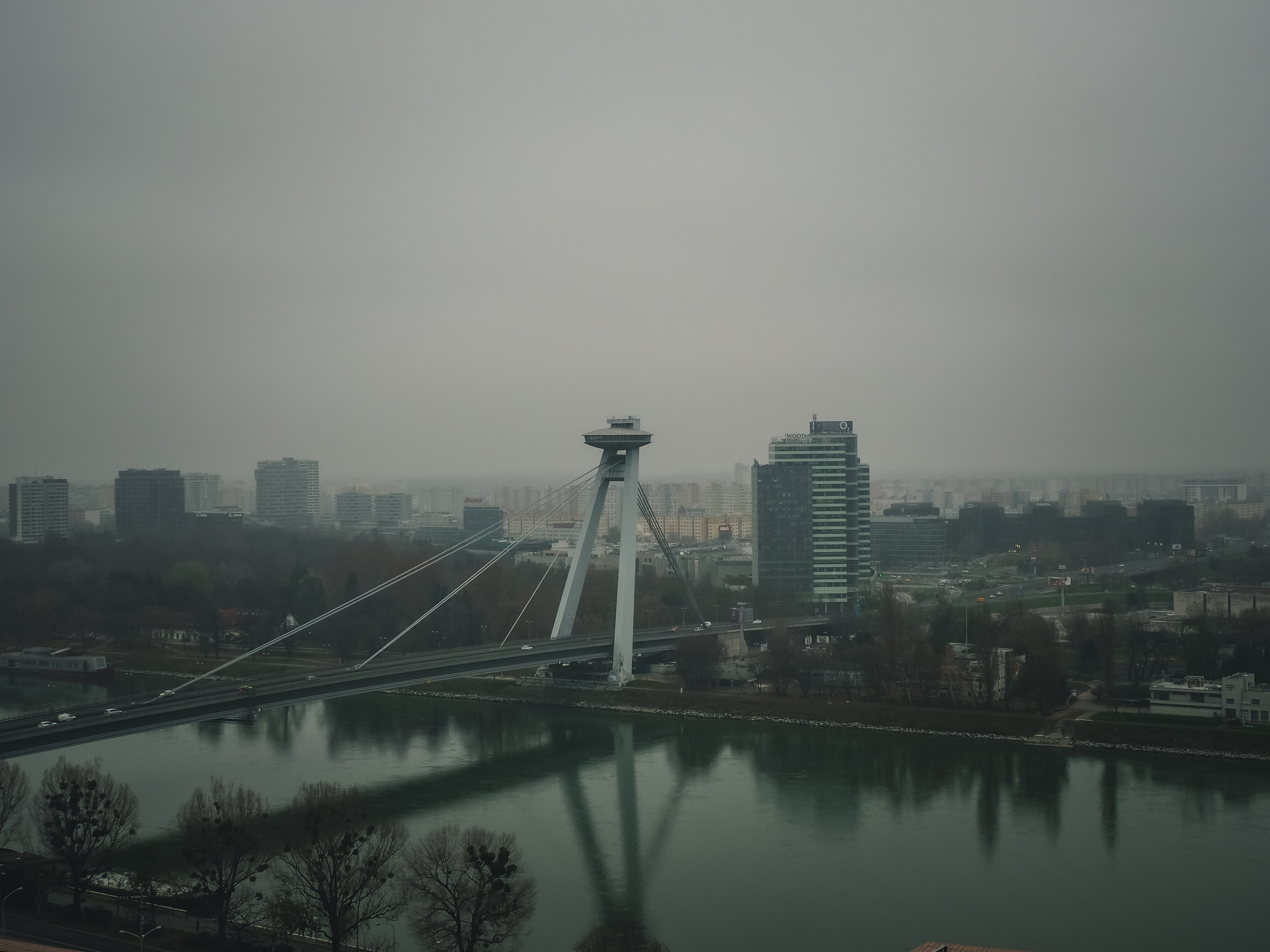 Après une nuit à une vingtaine de minutes de Bratislava, au bord du Danube et proche de la frontière hongroise, nous nous garons dans la capitale. Nous débutons par la petite ascension vers le Château qui offre une très belle vue sur le Danube et le Pont du soulèvement national slovaque (Novy Most). L’ancien poste frontière romain est devenu un château à partir du 9ème siècle. Détruit par les flammes en 1881, le château n’est reconstruit que dans les années cinquante et offre un aspect extérieur relativement terne.