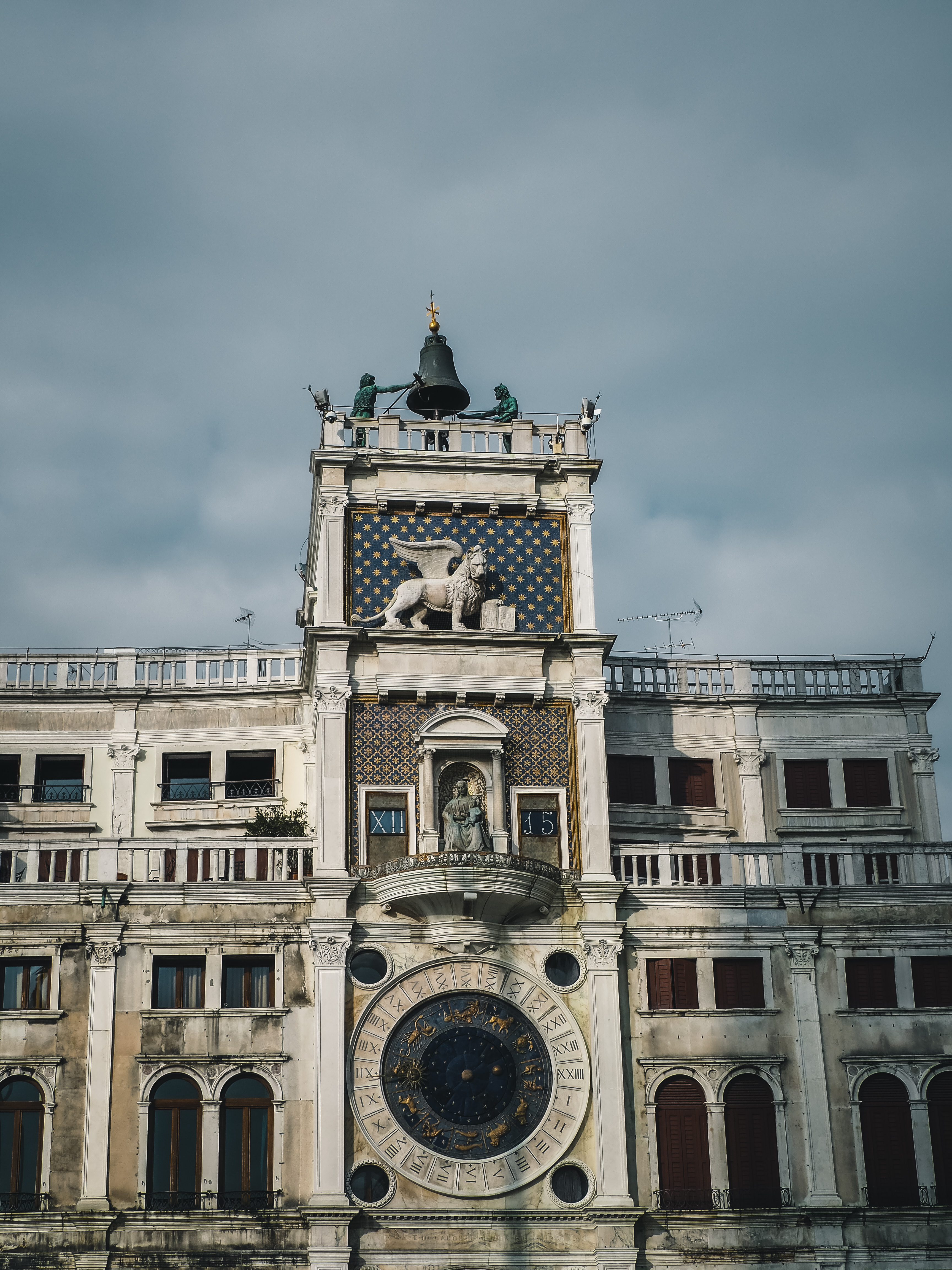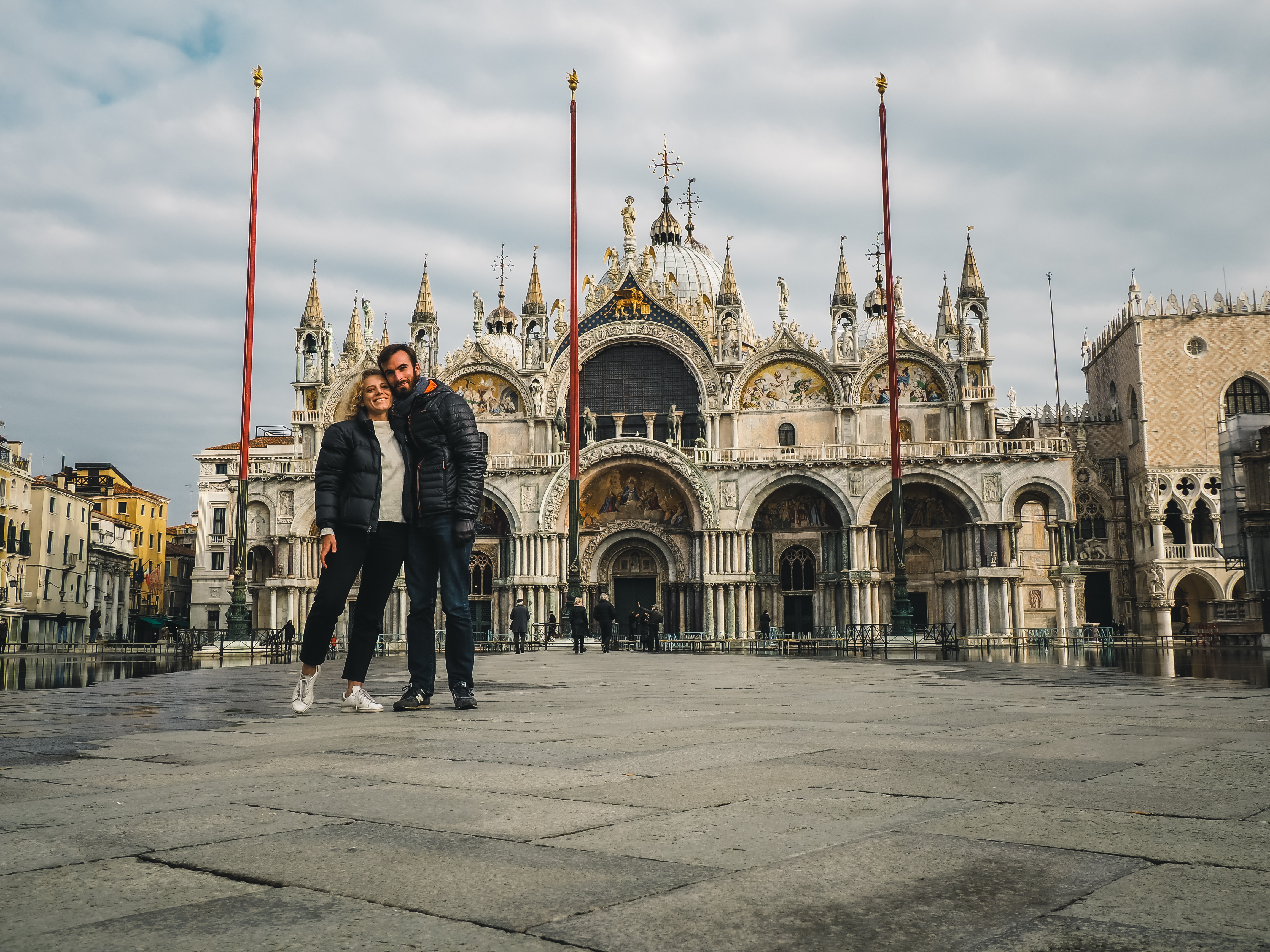 Nous arrivons place San Marco, devant la magnifique basilique du même nom, qui commence à avoir les pieds mouillés par la montée des eaux. Les vénitiens ont installé les passerelles en prévision de l’Acqua Alta qui est prévu quelques semaines après notre passage. Au pied du plus haut campanile de la ville nous nous arrêtons quelques instants pour profiter de ce moment si particulier : nous sommes presque seuls sur l’une des places les plus visitées du monde, même les pigeons ont déserté.