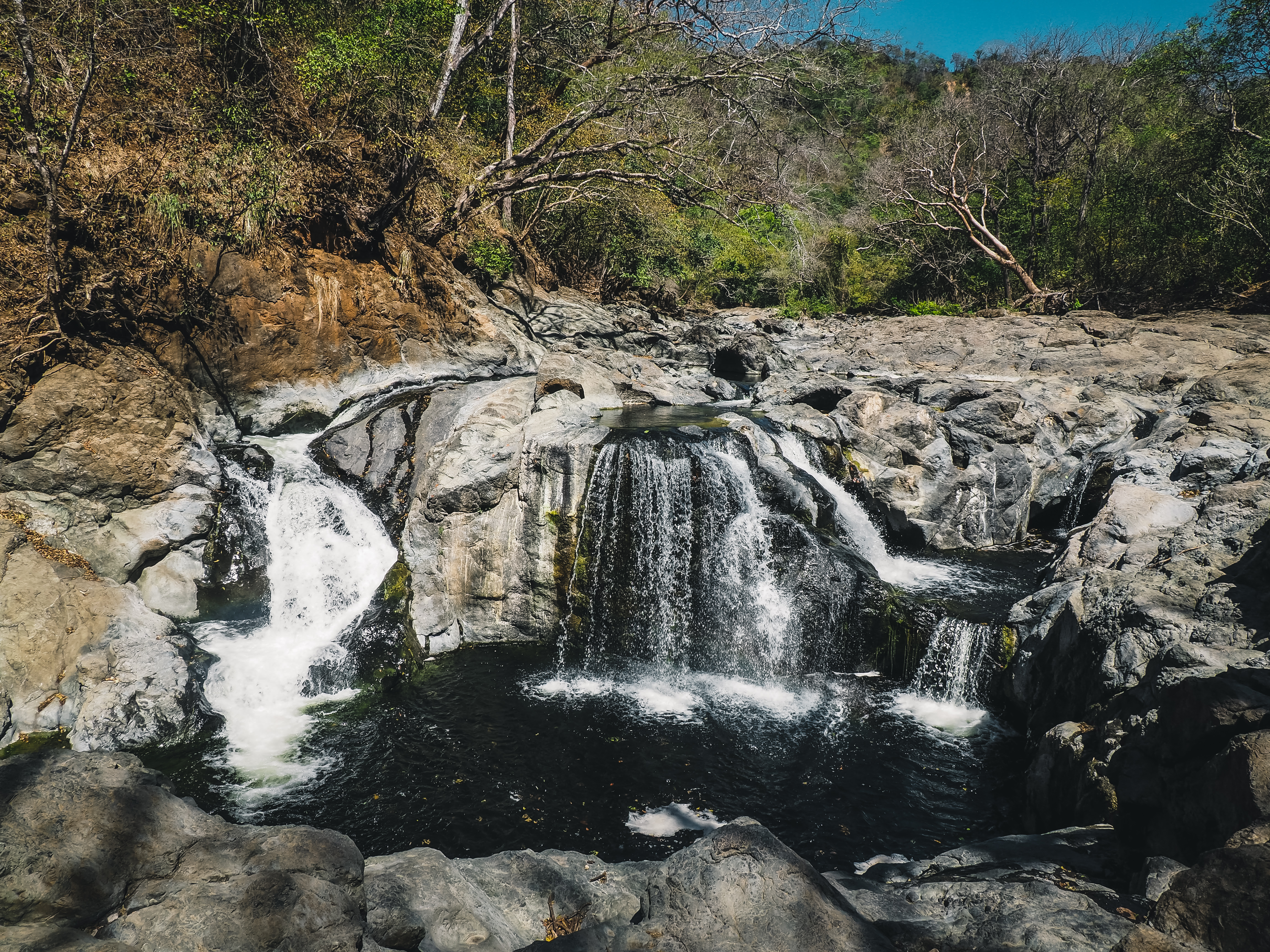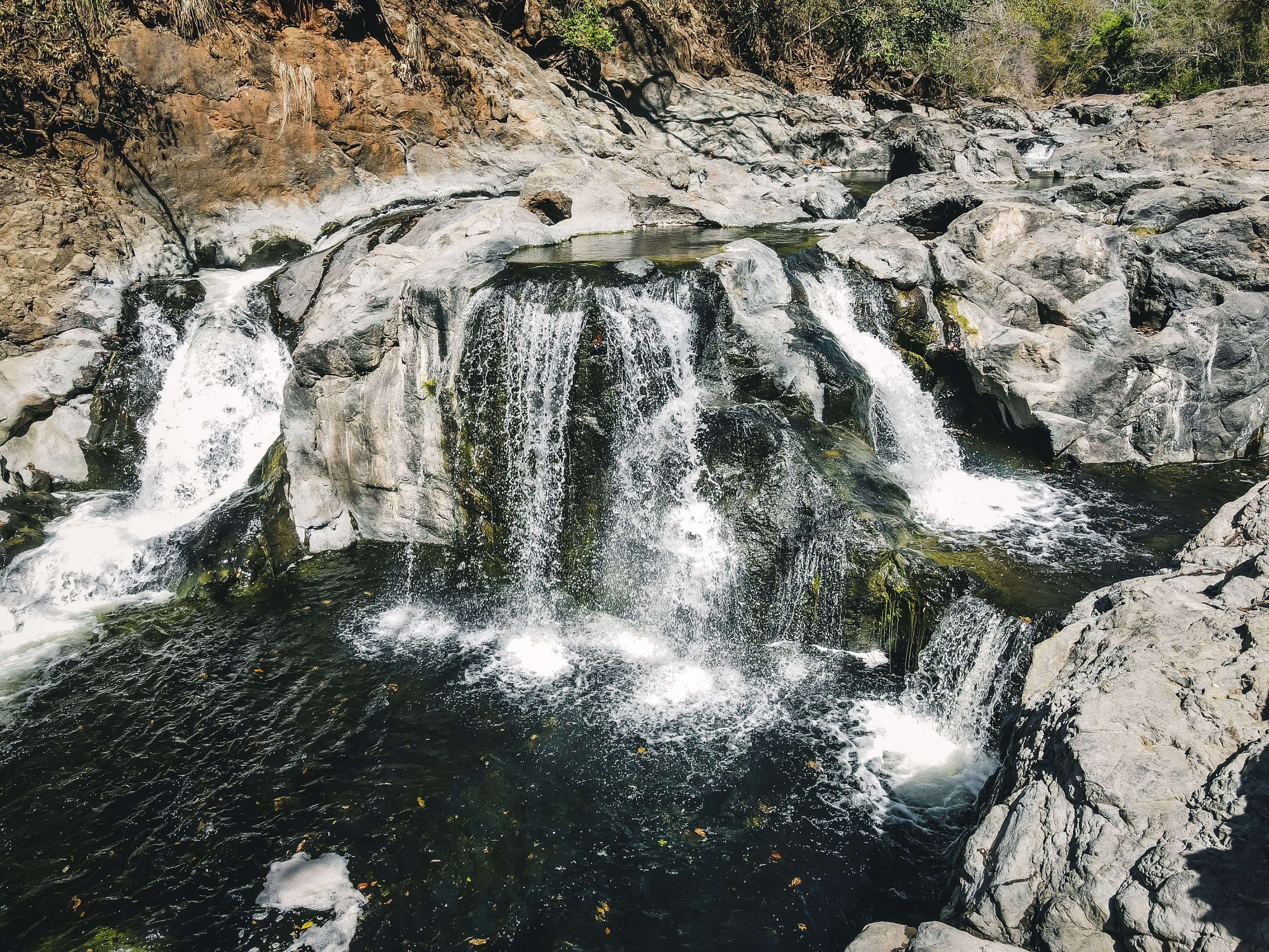 Le lendemain, nous nous dirigeons au Nord de Sámara vers Belén pour aller admirer l’une des cascades de la région. Après une piste cahoteuse, nous empruntons un chemin qui aboutit à ces fameuses chutes d’eau. Avec la saison sèche, le niveau de l’eau est assez faible mais le spectacle est tout de même saisissant. Nous pouvons également apercevoir la ligne atteinte par l’eau en saison des pluies ; ce qui confirme la dangerosité de certains de ces courts d’eau qui deviennent véritablement infranchissables.