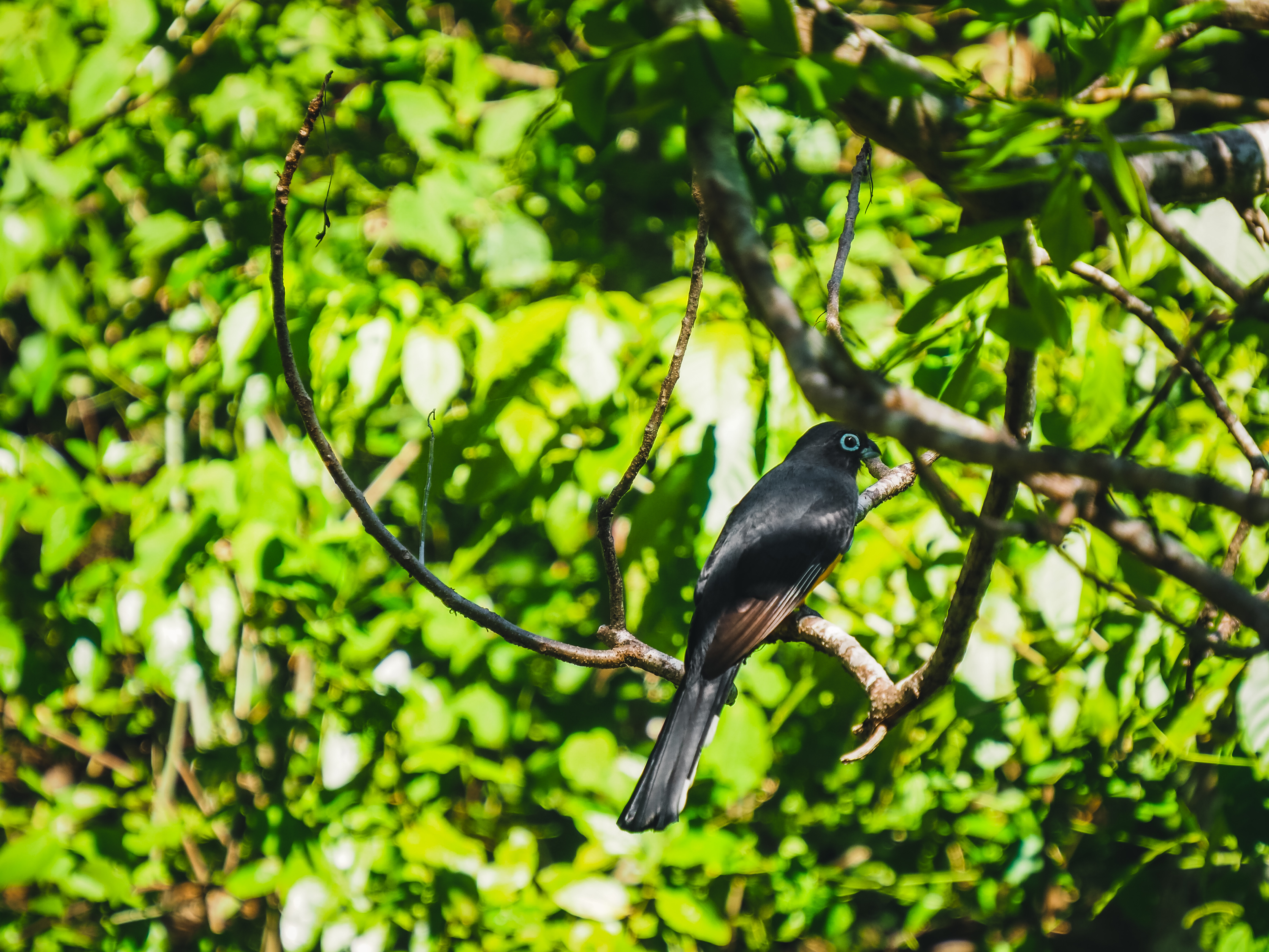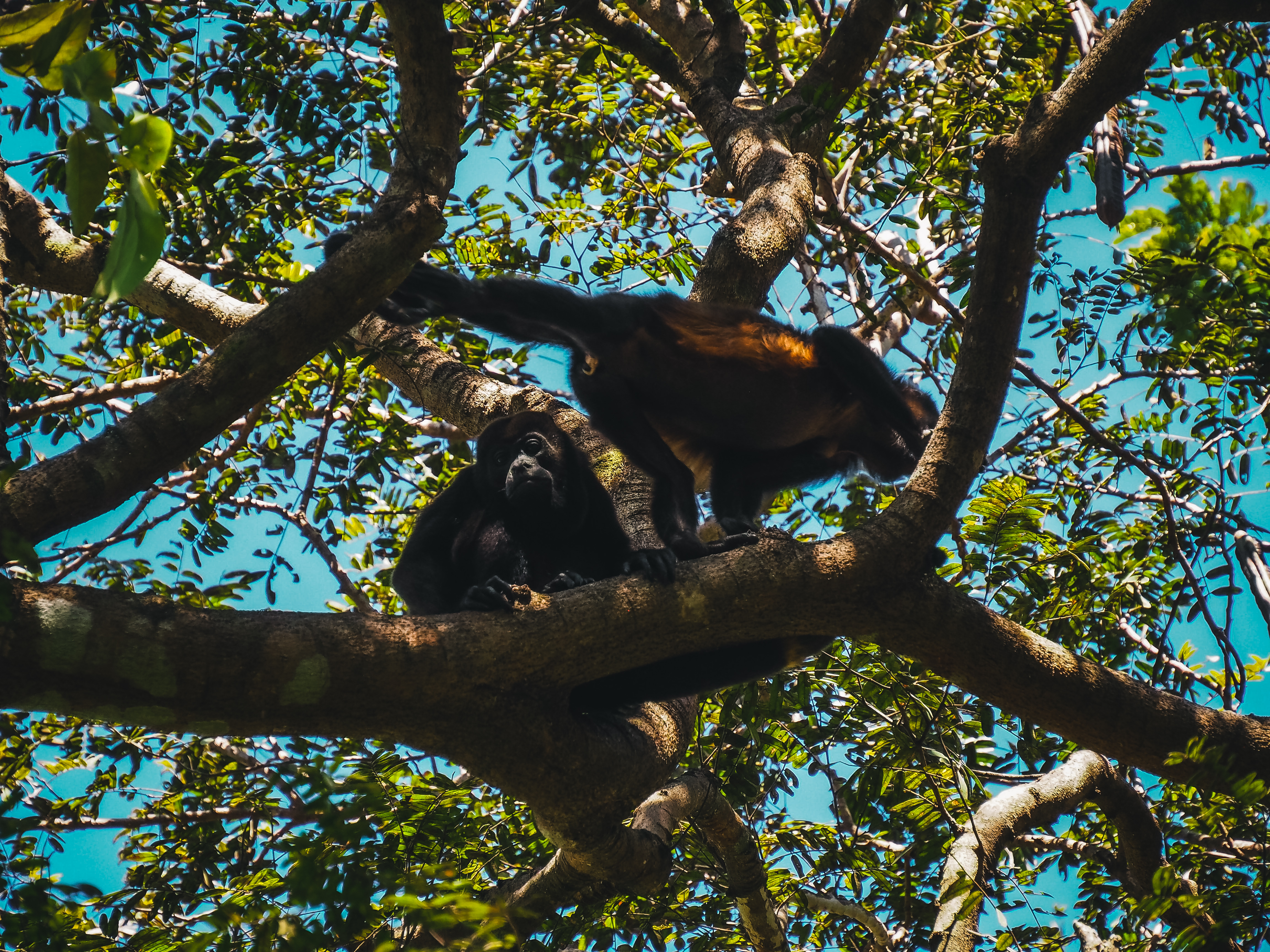 Le lendemain de notre arrivée, sur les conseils de Coco, nous prenons le sentier qui démarre juste en face de la Villa Tangerine en direction de la Playa Izquierda. Sur le chemin, nous sentons bien que nous ne sommes pas seuls. Les feuilles des arbres bougent régulièrement, les grognements des singes hurleurs résonnent autour de nous ; la nature réveillée nous accompagne dans notre randonnée matinale. Un premier point en hauteur nous offre une vue plongeante sur une crique en contrebas.
