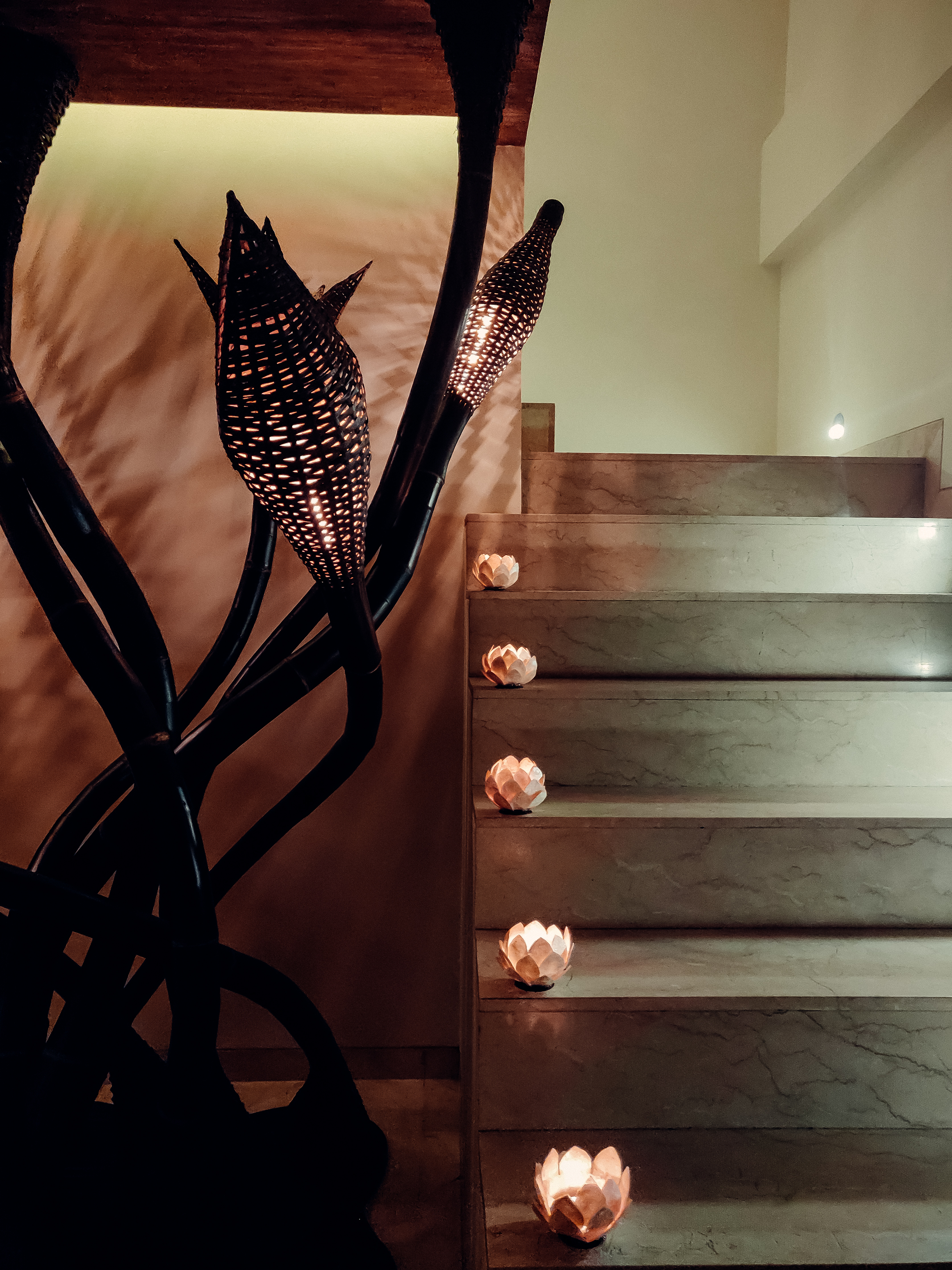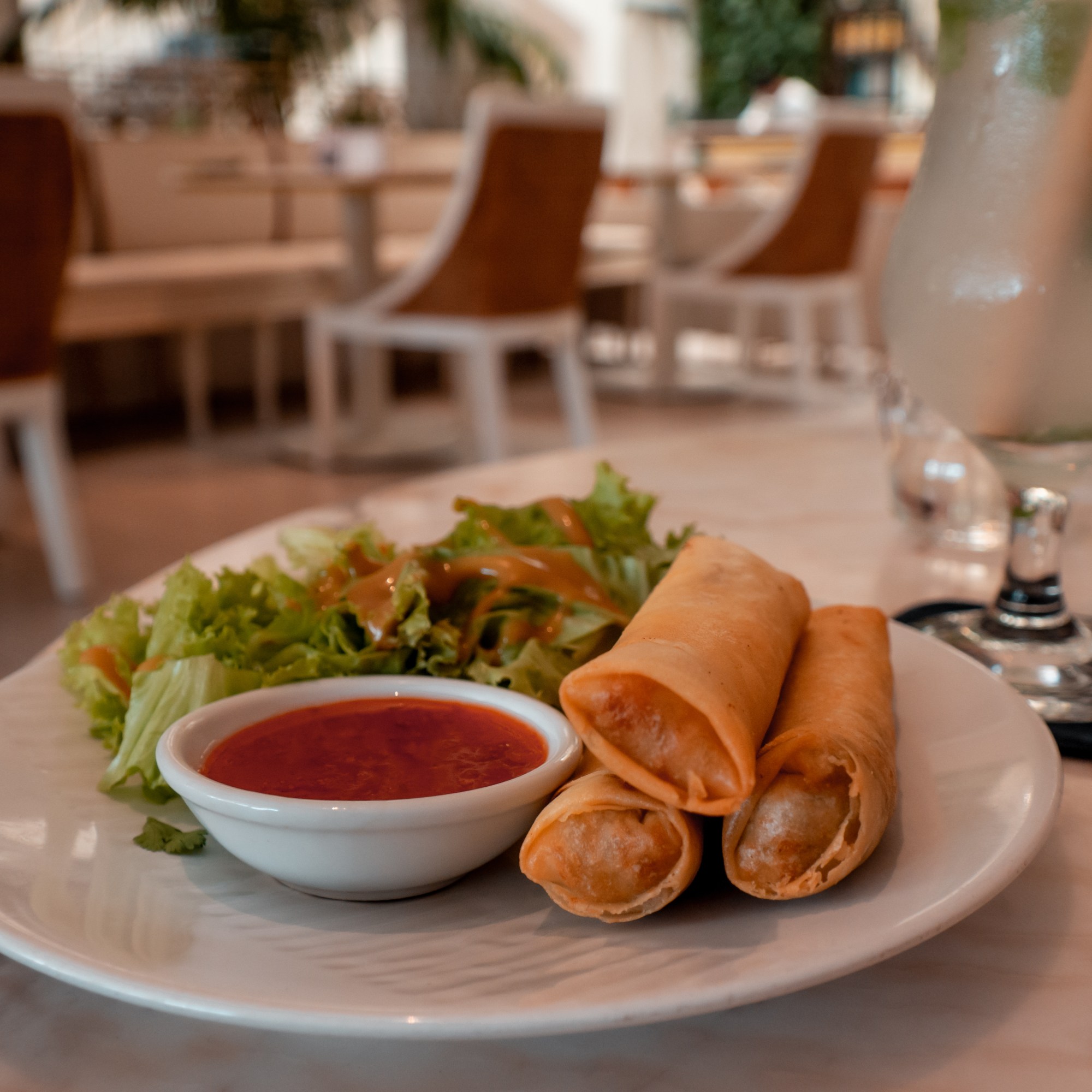 Cependant, après une manucure/pédicure pour Mathilde et un tour chez le barbier pour moi, nous sommes prêts à découvrir les petites pépites de Seminyak, comme la rue Kahyangan/Oberoi qui regorge de boutiques de créateurs. C’est dans cette rue animée que nous trouvons le restaurant dans lequel nous décidons de fêter notre arrivée en Indonésie : Batik Restaurant. Derrière sa façade blanche, l’établissement propose, dans un cadre agréable et lumineux, une cuisine d’Asie du Sud Est délicieuse. Nous redécouvrons ainsi des saveurs indonésiennes telles que les lumpia (nems indonésiens) ou encore le satay ayam (brochette de poulet) avec sa peanut sauce. La décoration intérieure du restaurant accorde une place importante à l’art du batik, cette technique javanaise d’impression sur tissus.