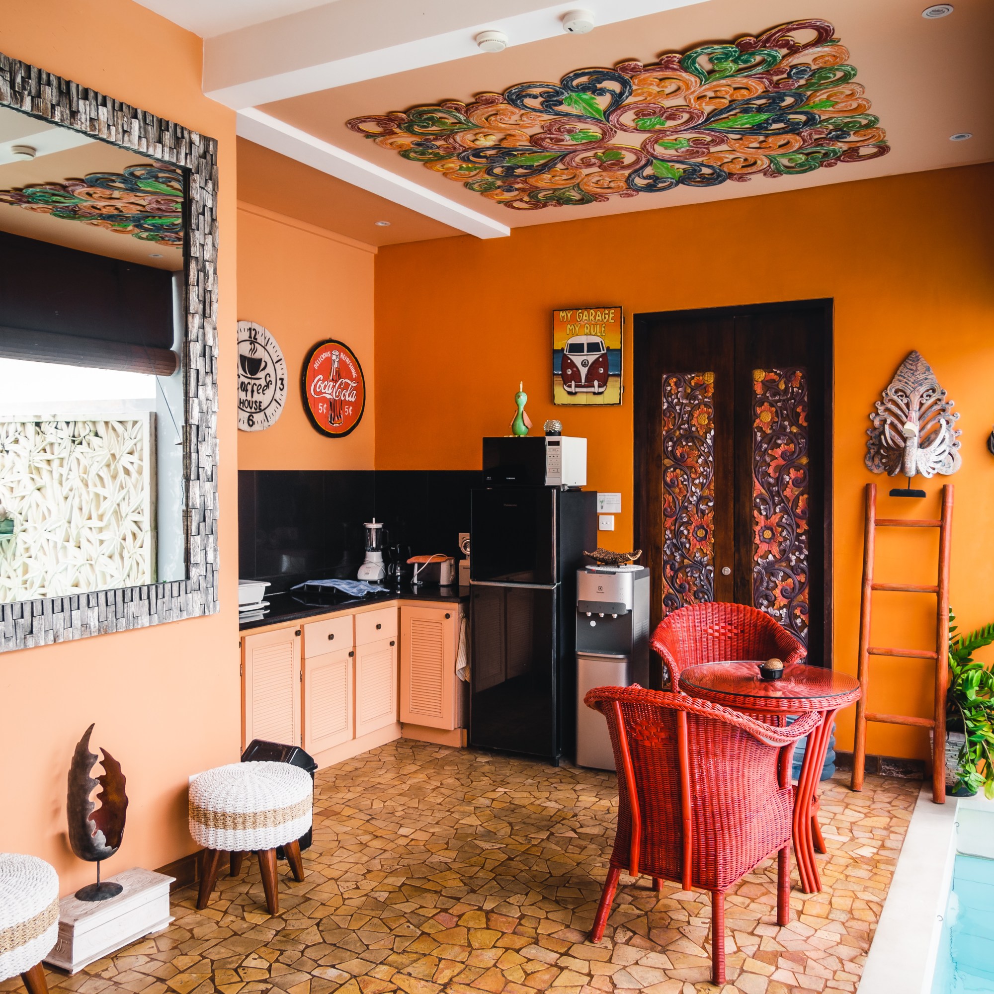 Nos 2 tests PCR sont négatifs, nous pouvons sortir. Nous retournons à l’aéroport de Jakarta pour prendre notre vol, domestique cette fois, pour Denpasar. Nous touchons réellement du doigt la fin de notre marathon pour commencer le premier jour du reste de nos aventures : la vie d’expatriés à Bali. Après quelques rapides formalités à l’arrivée, nous retrouvons un guide de Bali Autrement (notre sponsor) qui nous conduit jusqu’à Seminyak où se trouve notre villa pour le premier mois. Nous apprécions cette maison constituée d’une chambre, d’une cuisine et d’un salon ouvert sur la petite piscine dans une impasse très calme.