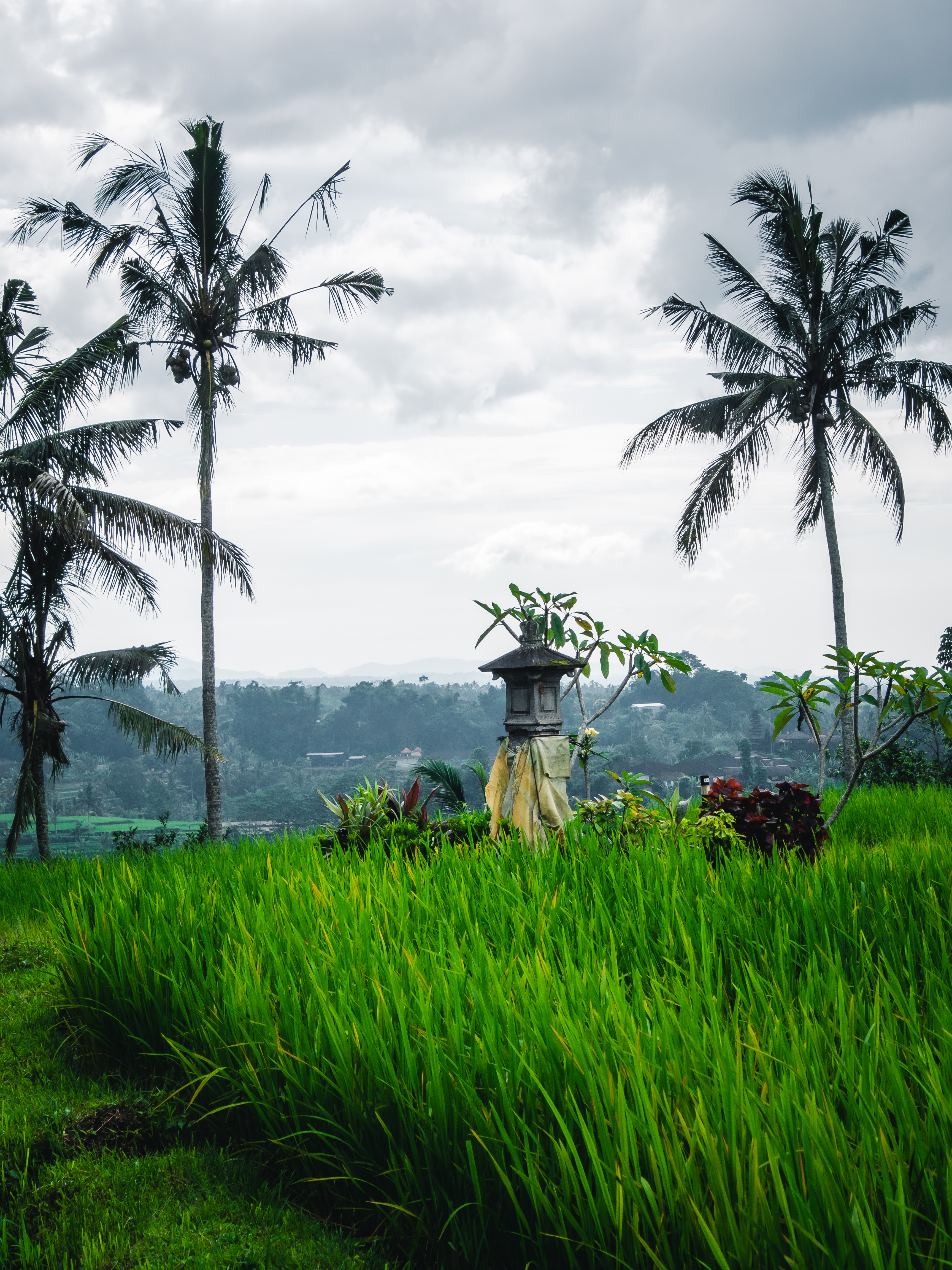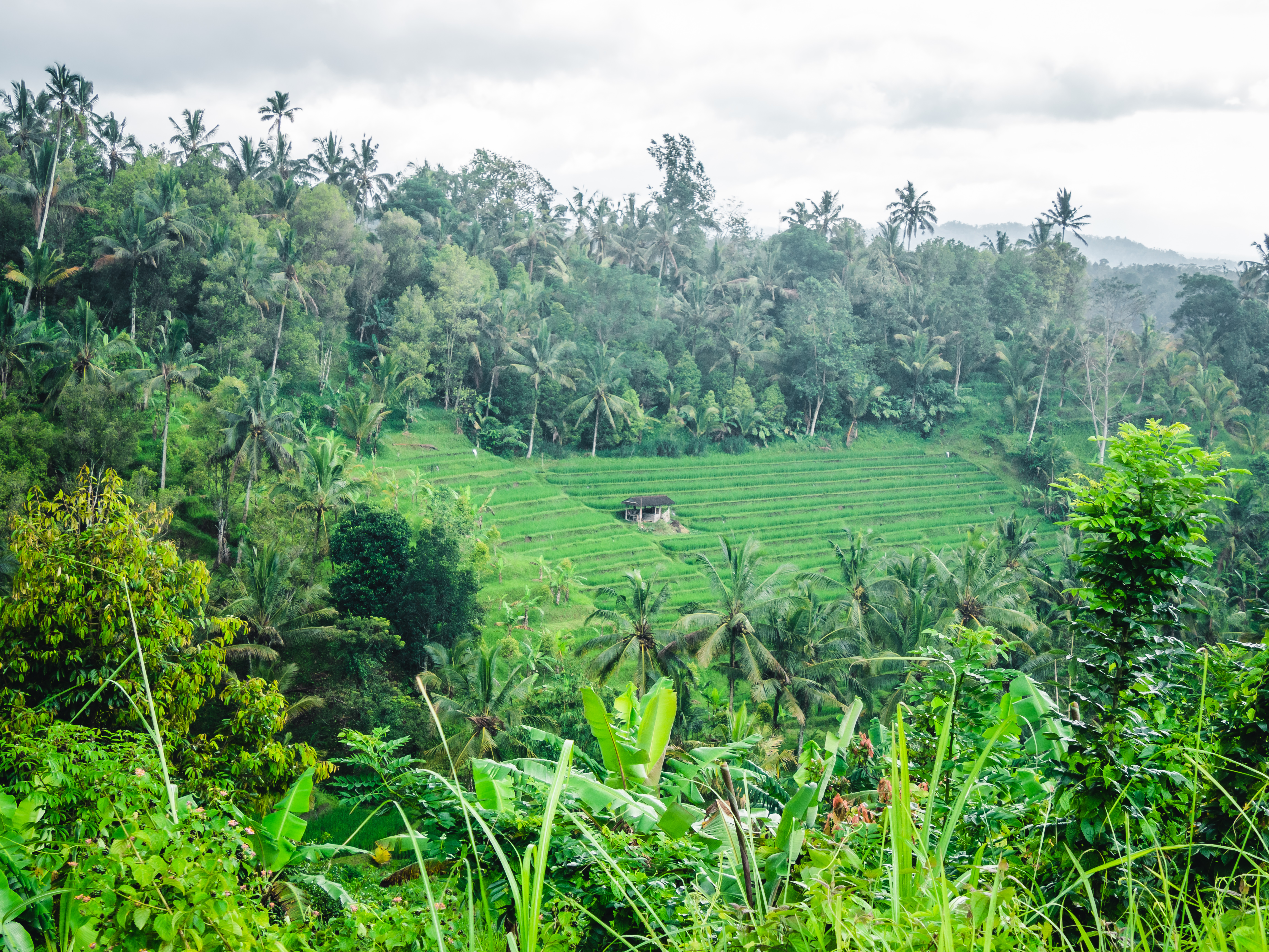 Au petit matin, nous retrouvons Made Seneng et son fils qui viennent nous chercher en voiture directement à notre villa (en Indonésie, il est très courant que le transport jusqu’au lieu de l’activité soit inclus). Nous quittons Seminyak à travers les nombreuses ruelles des villages alentours. Tous ces endroits qui se ressemblent les uns les autres nous sont peu familiers. Les nuages découvrent peu à peu les monts Batukaru et Adeng au loin, nous prenons de la hauteur avant d’atteindre notre première étape : le belvédère de Jatiluwih. Situé à 700 mètres d’altitude, ce point de vue est l’un des plus beaux qu’offre l’île des dieux. Classés au patrimoine mondial de l’Unesco depuis 2012, ces milliers d’hectares de rizières en terrasse sont l’une des fiertés de Bali. Ces plantations monumentales sont le fruit d’une agriculture traditionnelle, transmise de génération en génération depuis le 9ème siècle.
