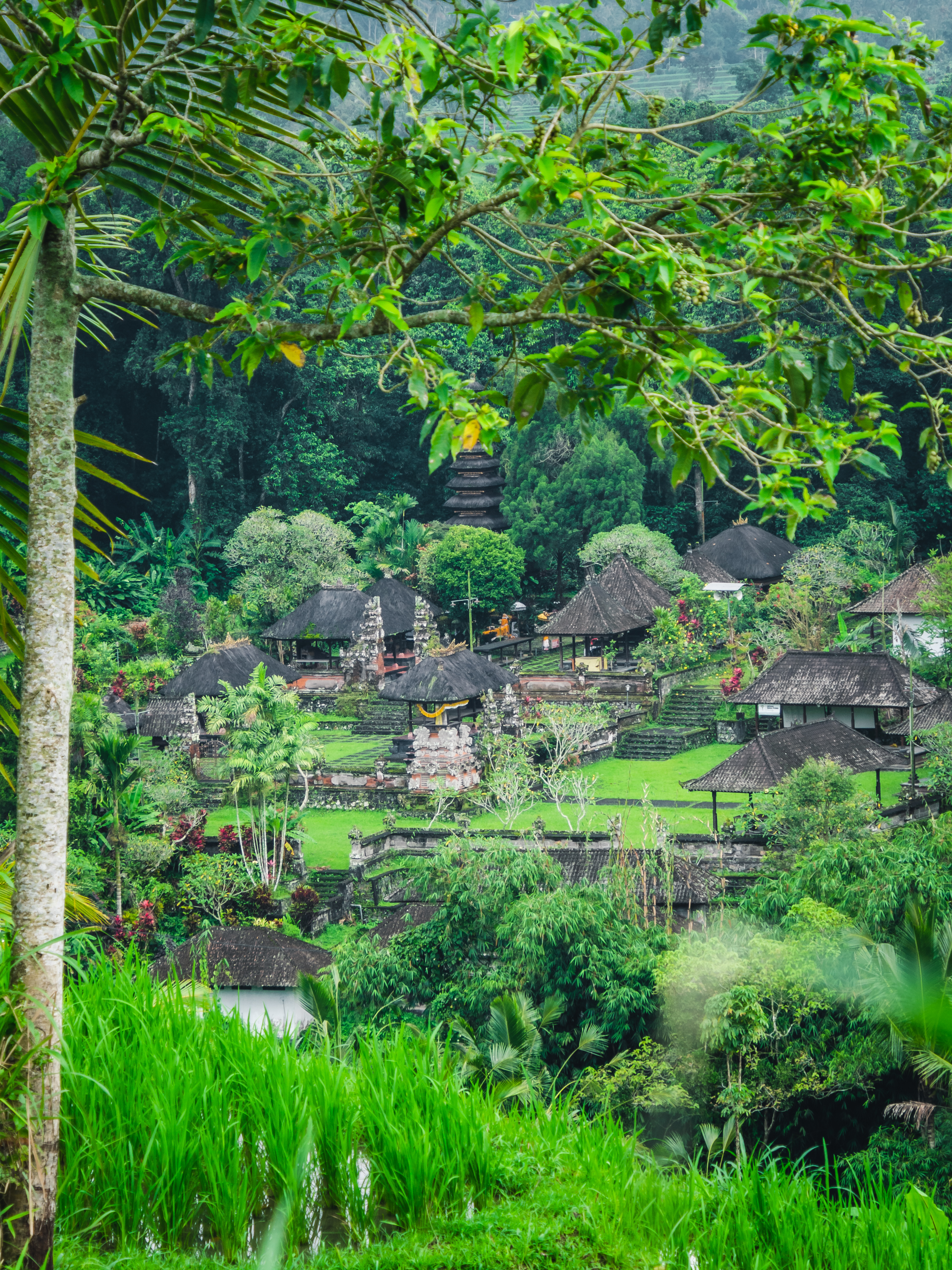 Entre ravins escarpés et forêt tropicale, nous commençons un petit trek au milieu d’une verdure luxuriante. C’est l’occasion pour Made de nous expliquer le fonctionnement de l’agriculture balinaise. Ces rizières en terrasse reposent avant tout sur un système d’irrigation communautaire écologique et durable : le Subak. La gestion coopérative de l’eau permet à chaque agriculteur de bénéficier de l’irrigation suffisante pour ses rizières quelque soit leur place dans les terrasses. Au-delà du simple apport d’eau, le Subak est également une réalité sociale et religieuse. Au centre de chaque Subak, se trouve un temple de l’eau, géré par les religieux. Ce lieu de culte permet aux fidèles d’adorer les dieux et déesses de la prospérité et de la fertilité. A Bali, le riz est considéré comme une offrande et tout le processus, de la plantation à la récolte, est sacré. Chaque Subak régit ainsi le cycle de plantation, d’irrigation et de récolte des terres alentours pour coordonner l’utilisation de l’eau pour des régions entières. Au cours de notre marche, nous passons sur le versant opposé au magnifique et paisible temple de Besikalung considéré comme l’un des plus sacrés de Bali.