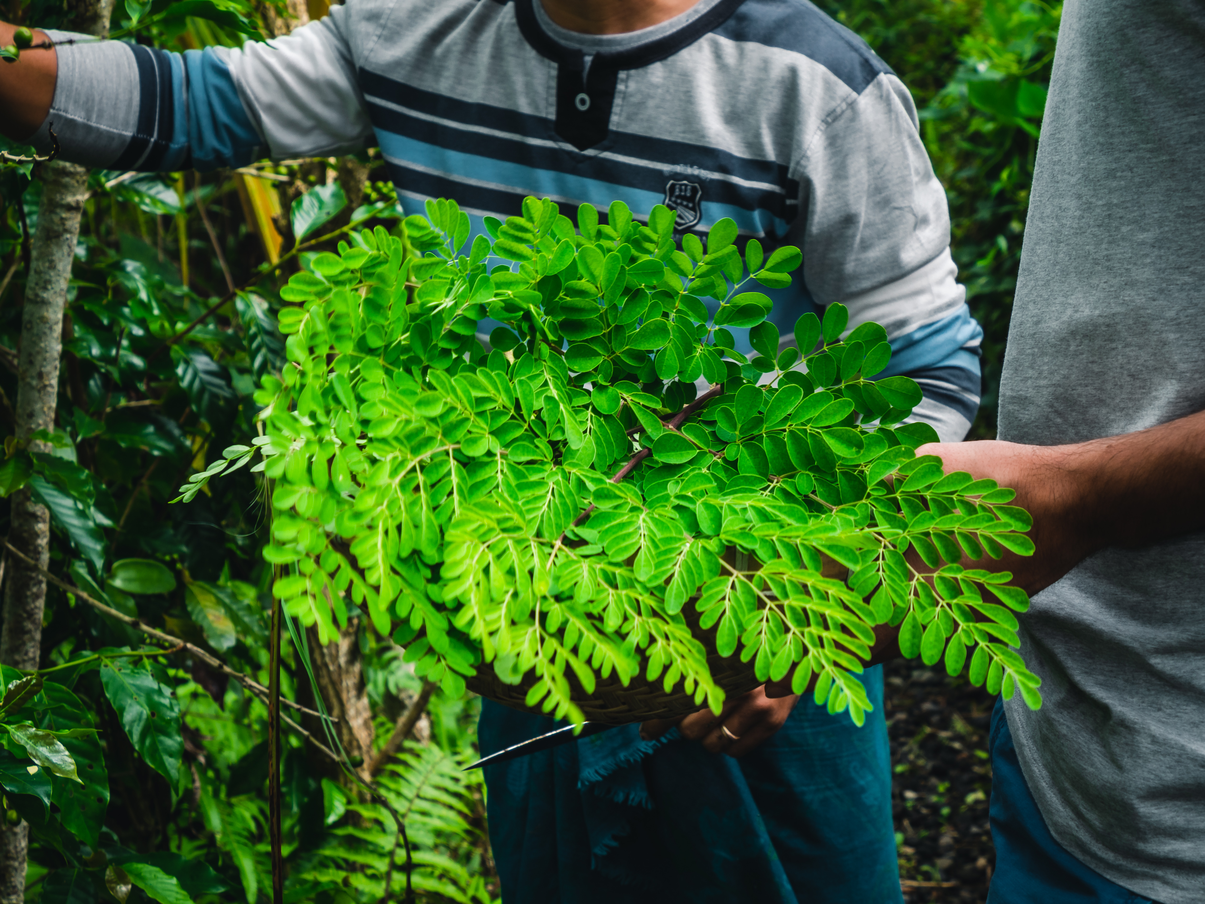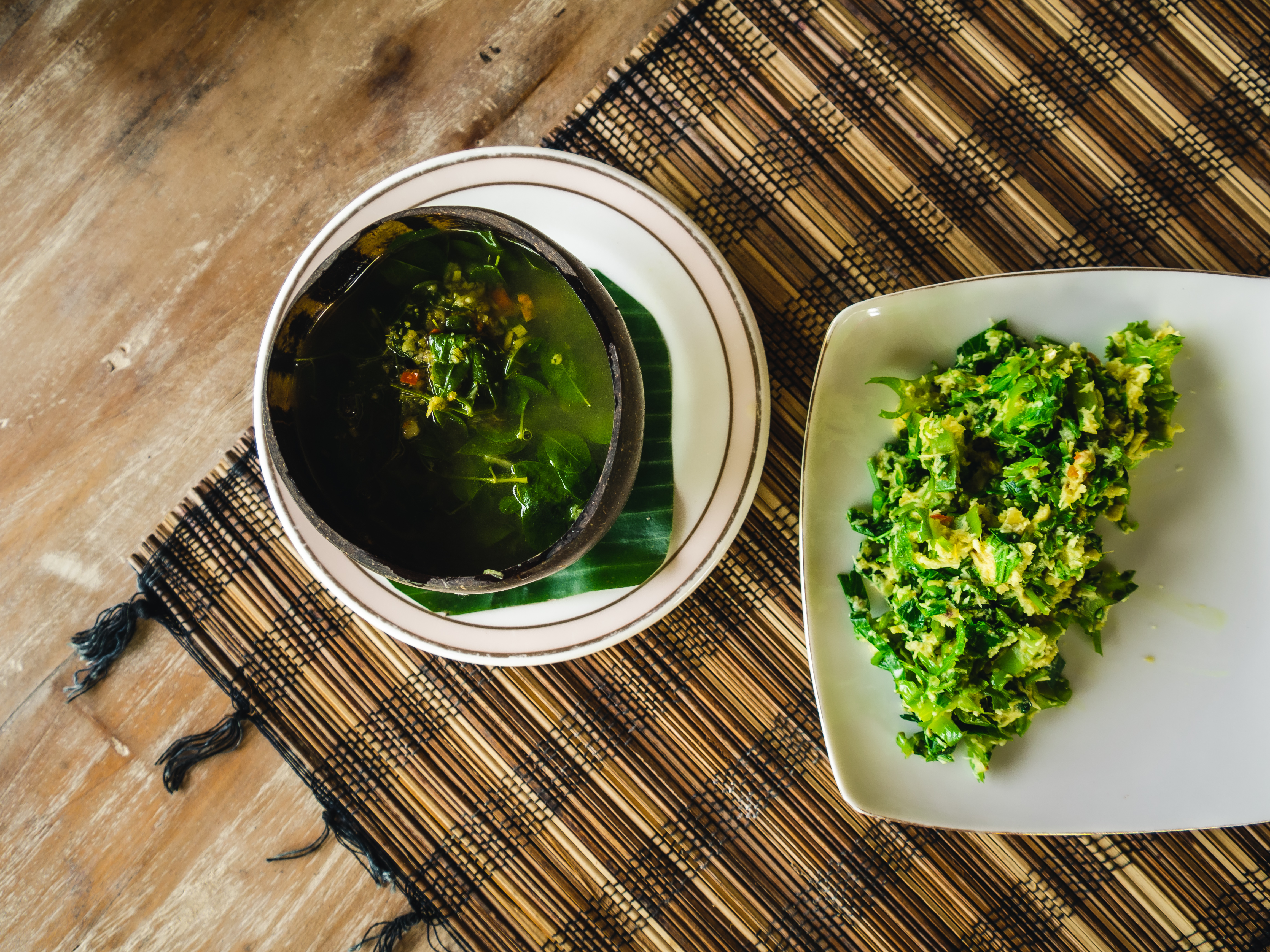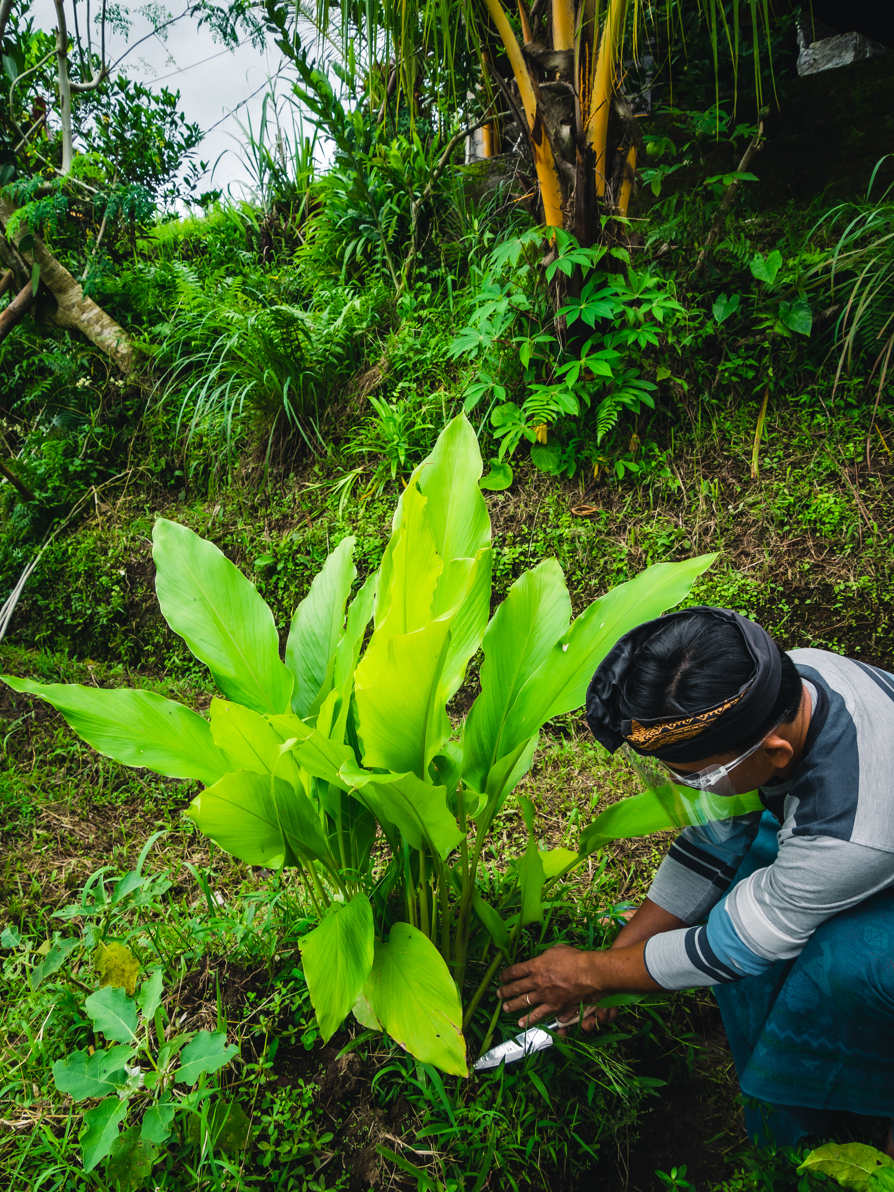 Nous arrivons alors à destination pour la seconde étape de cette expérience : le cours de cuisine balinaise. Made nous reçoit dans sa maison qui domine ses rizières et son jardin biologique. Nous sommes accueillis par sa femme et sa belle-mère alors, qu’un peu plus loin, nous apercevons ses enfants, contraints de suivre leurs cours à distance à cause de la pandémie. Le lieu est calme et respire la sérénité. Made est parti revêtir la tenue traditionnelle balinaise avant de revenir nous enseigner près de 10 recettes de base de la gastronomie de l’île. Le cours de cuisine débute par la sélection des ingrédients. Ici, pas besoin de se rendre au supermarché – d’ailleurs inexistant –, tout est à portée de mains. Nous nous baissons pour cueillir des haricots dragon, ramasser du gingembre, du piment, du curcuma avant de remonter nous placer derrière les fourneaux.