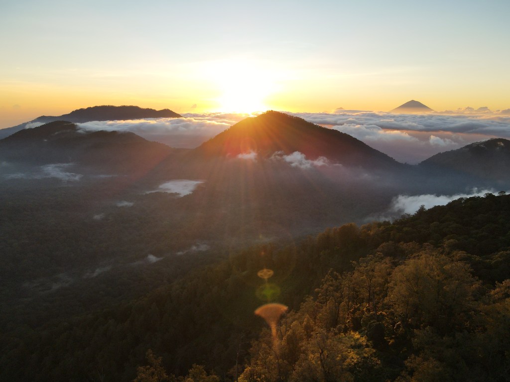 Je continue seul. A marche forcée, je parviens au sommet, non sans être essoufflé. Mais l’effort est récompensé. Je découvre un petit temple perdu au milieu de la clairière sommitale. La vue est superbe. Depuis les 2093 mètres d’altitude, je domine la mer de nuage prise dans la chaîne de montagnes du cœur de l’île des dieux. Au fond, l’œil du jour embrase les sommets alentours de reflets orangés. Je sors le drone pour capturer ce moment magique et partager avec Mathilde la récompense de sa détermination.