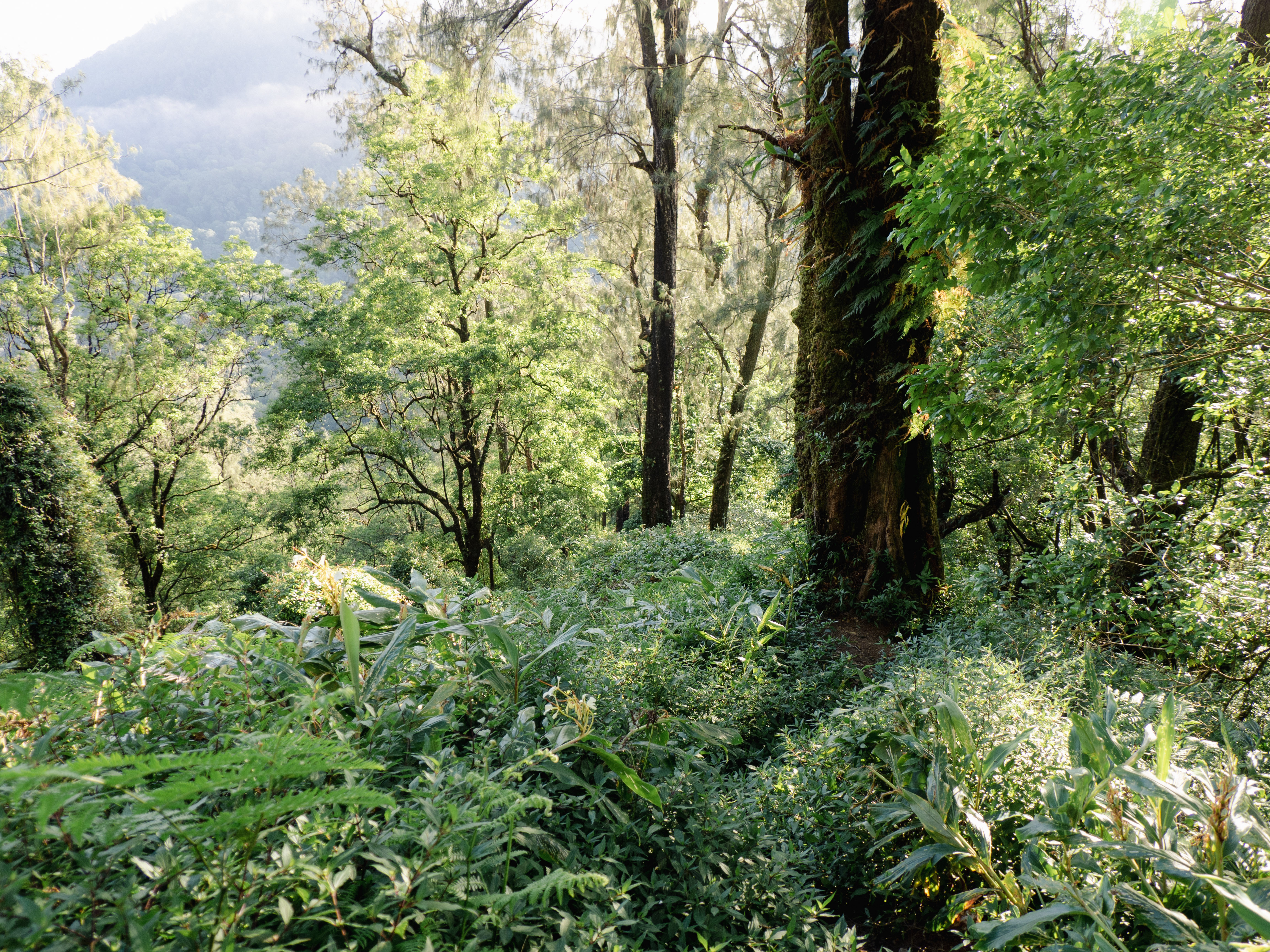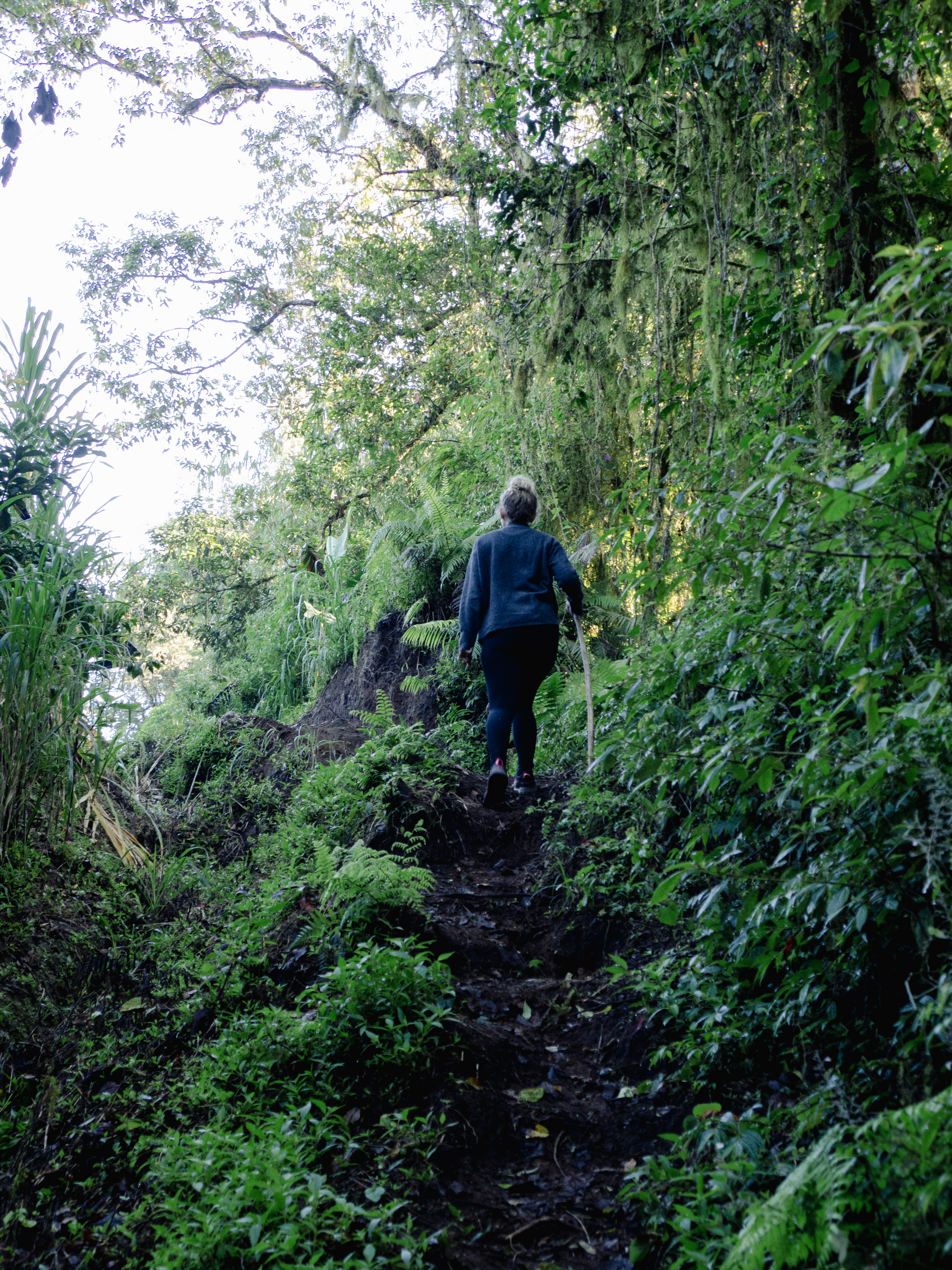 Nous parcours les 5 premiers kilomètres en 1h et commençons à apercevoir l’ombre du mont. Une grande masse noire triangulaire se dresse sur notre droite. Encore un dernier virage et nous voilà au pied de l’ascension finale de 3 kilomètres. Le décor change. Nous plongeons dans une dense forêt primaire. Le chemin disparaît peu à peu, recouvert d’une végétation humide qui nous chatouille les genoux. Il fait plus frais. La pente est abrupte, ponctuée de marches et de racines qui nous coupent le passage.