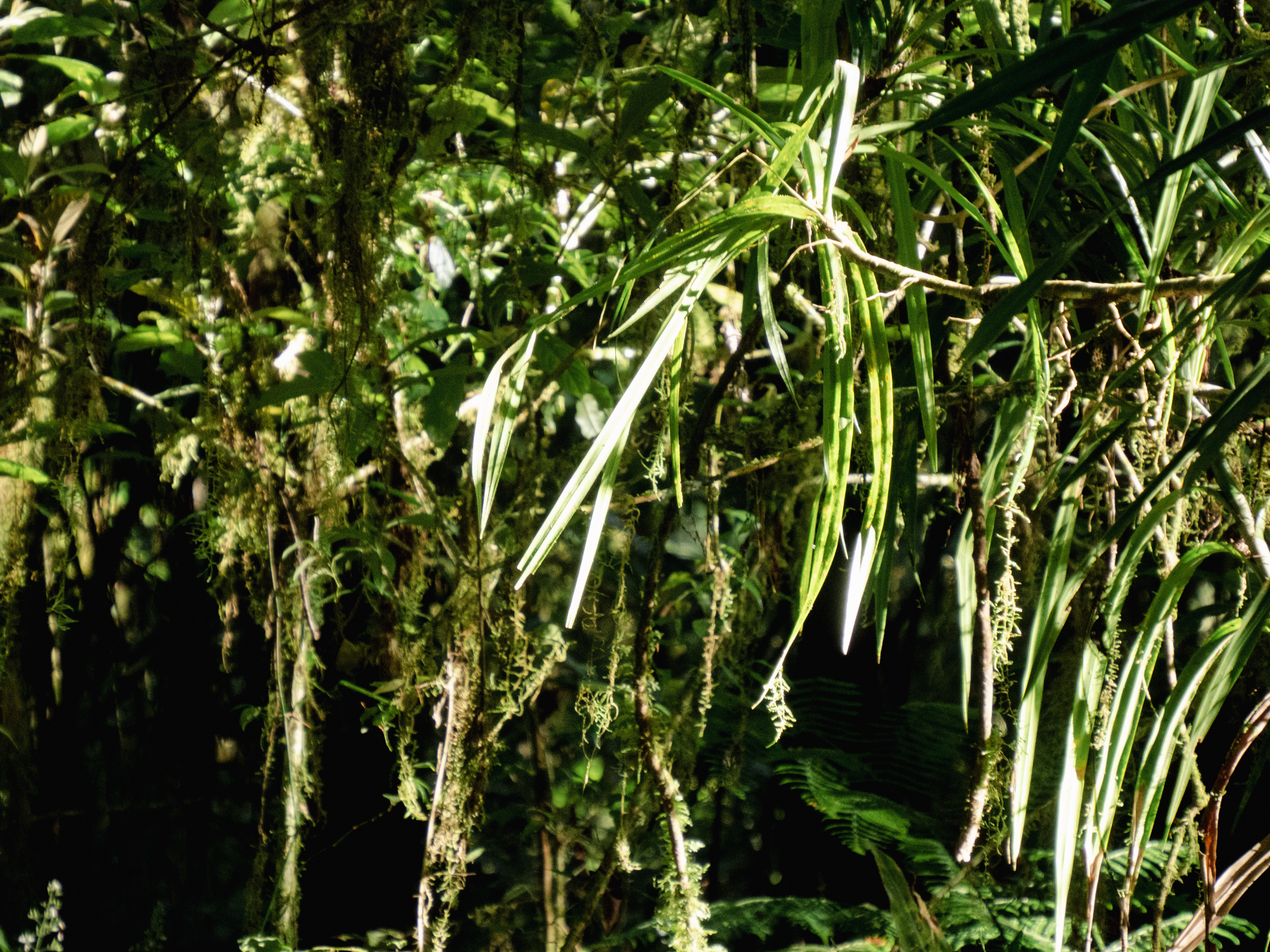 Je profite encore quelques minutes de ce temps suspendu avant d’entamer la descente pour retrouver Mathilde et Laurent. Le terrain est glissant. Il faut avancer prudemment. Je quitte les cimes, m’enfonce à nouveau dans la forêt et découvre les couleurs d’un décors appréhendé durant la nuit. L’environnement revêt des allures presque féériques. Les feuilles laissent filtrer une lumière tamisée faisant danser l’atmosphère au rythme des ombres et des chants des oiseaux qui s’éveillent.