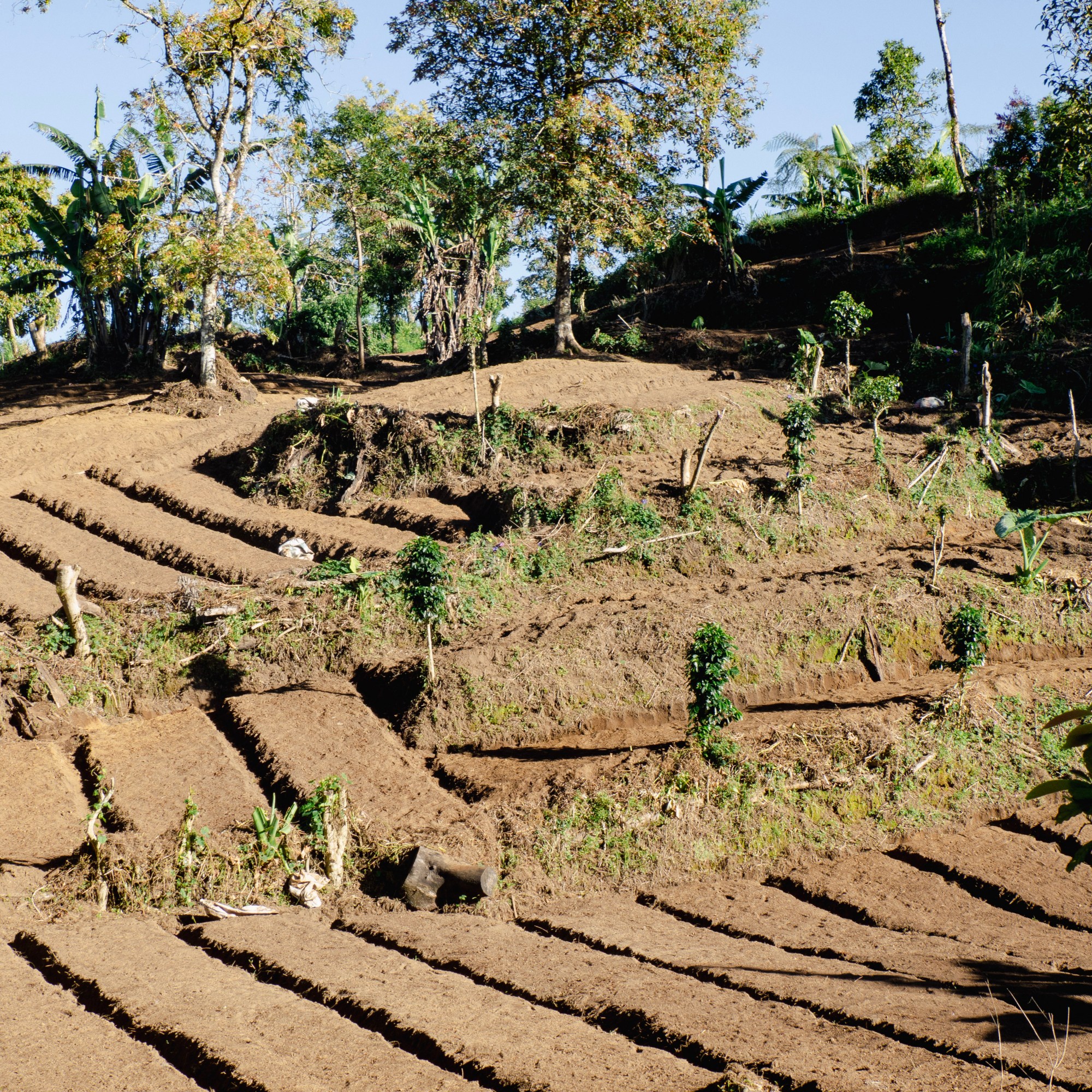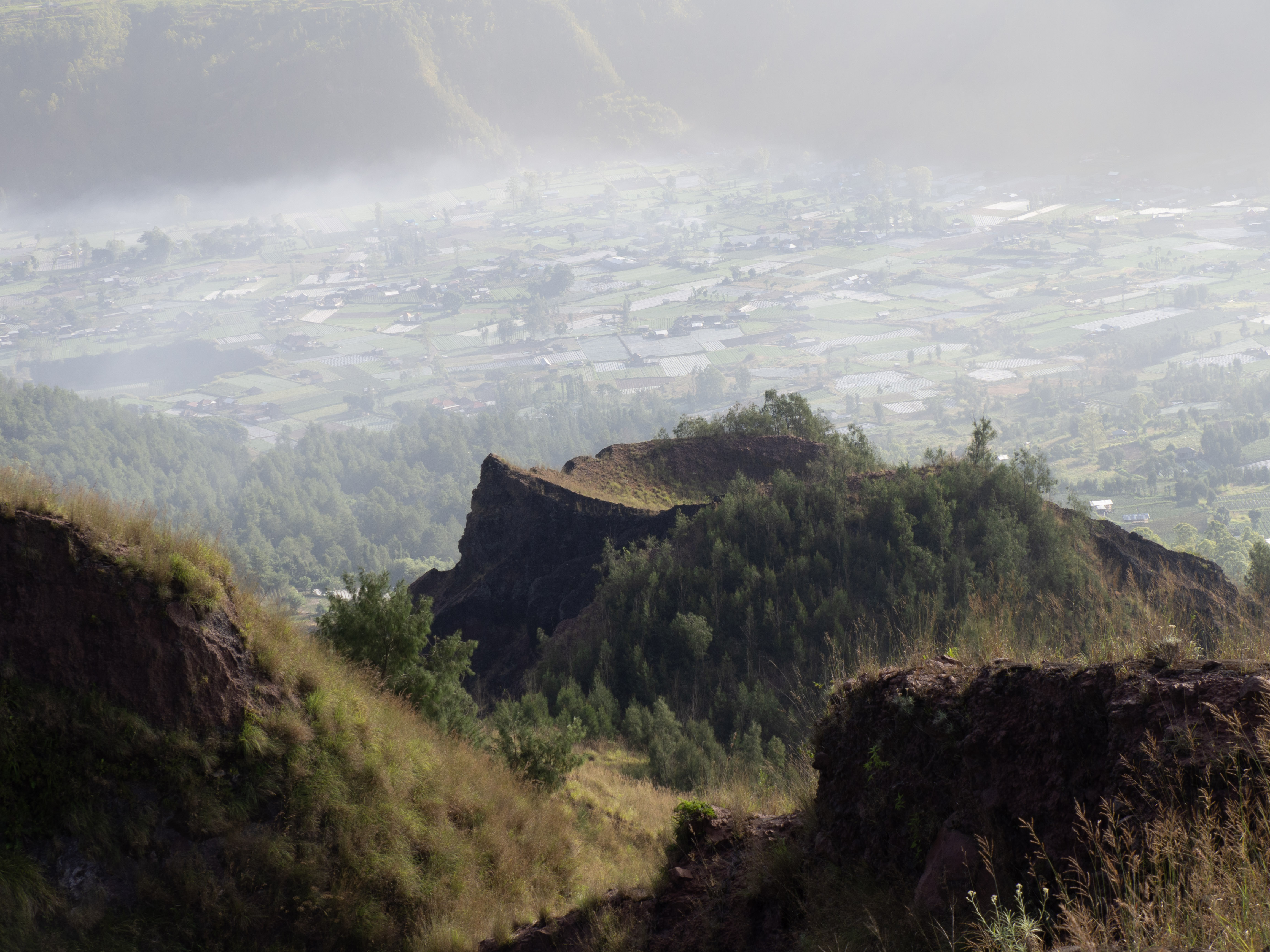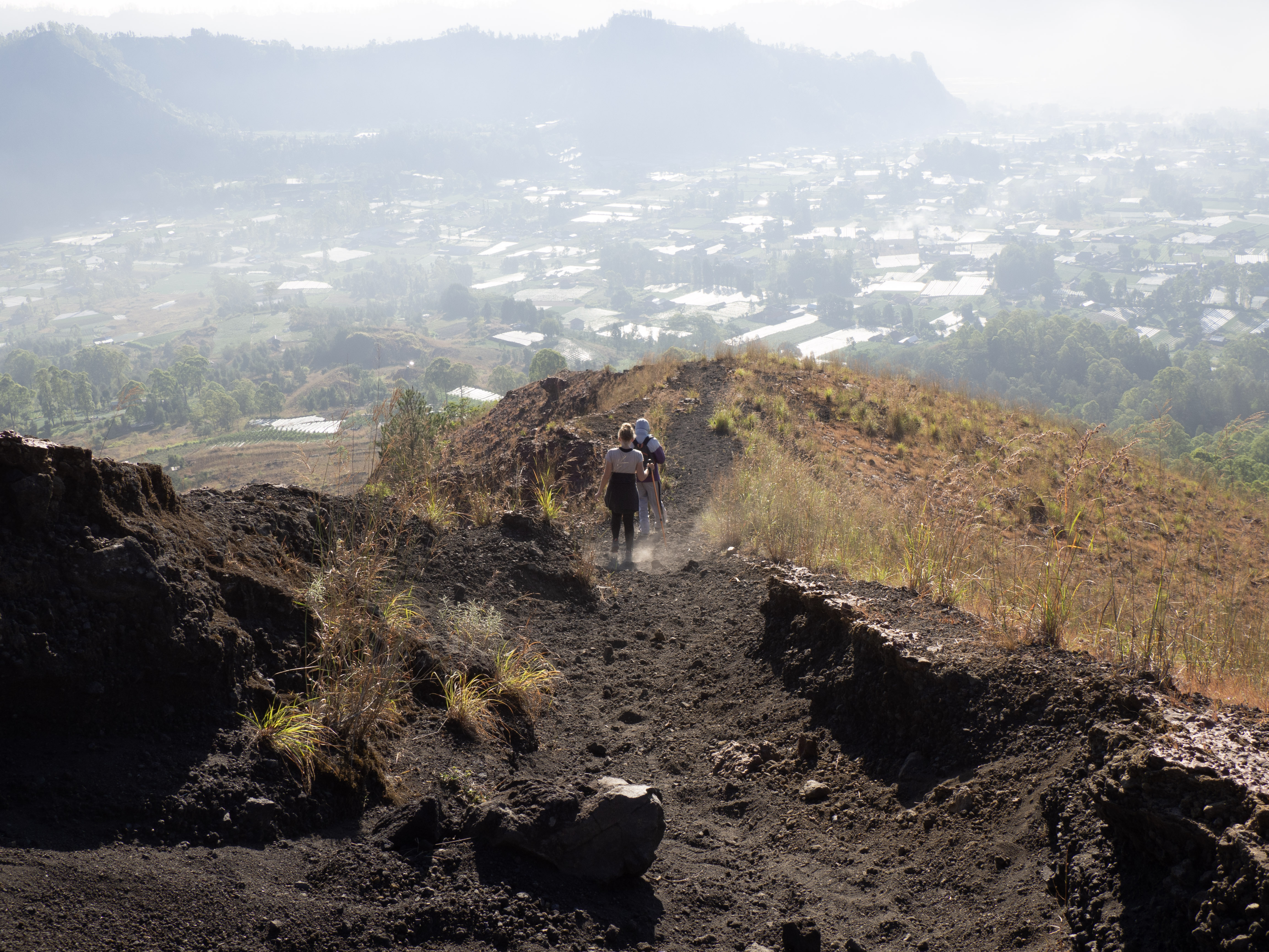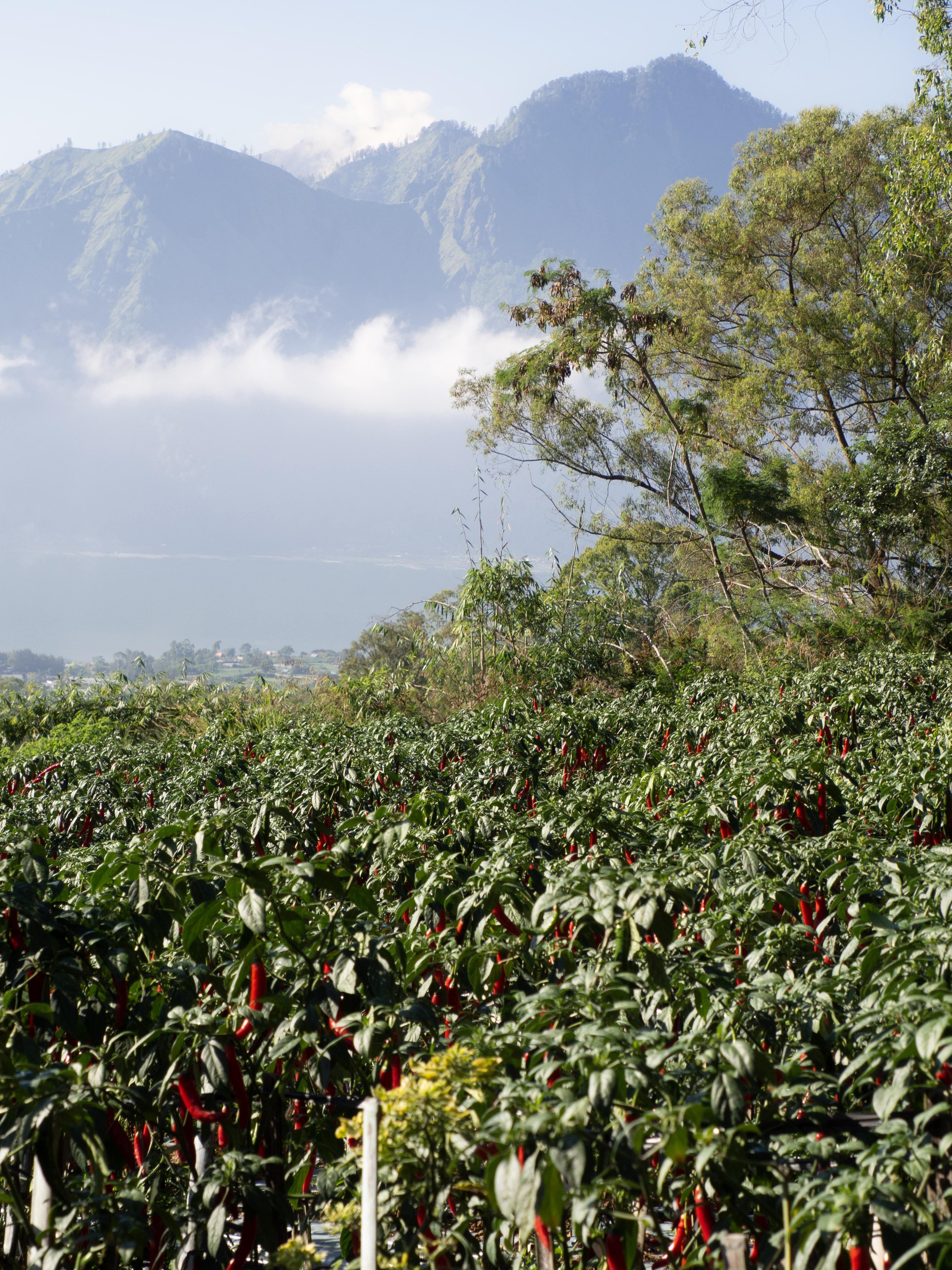 Il est maintenant temps de redescendre. En suivant le même chemin, nous découvrons le paysage qui nous entoure. La végétation est rare sur les flancs du volcan mais laisse place à des terres fertiles dans la vallée. Nous dévalons la pente, nous amusant des glissades que nous pouvons réaliser sur ce sol sablonneux. Dans la vallée, nous marchons entre les terres cultivées : tomates, poivrons, échalotes, oignons, nous sommes au cœur de l’une des régions les plus productives de Bali. Si les volcans alentours sont parfois craints pour leur puissance destructrice, ils offrent aussi la générosité créatrice et nourricière qui permet aux habitants de la région de vivre.