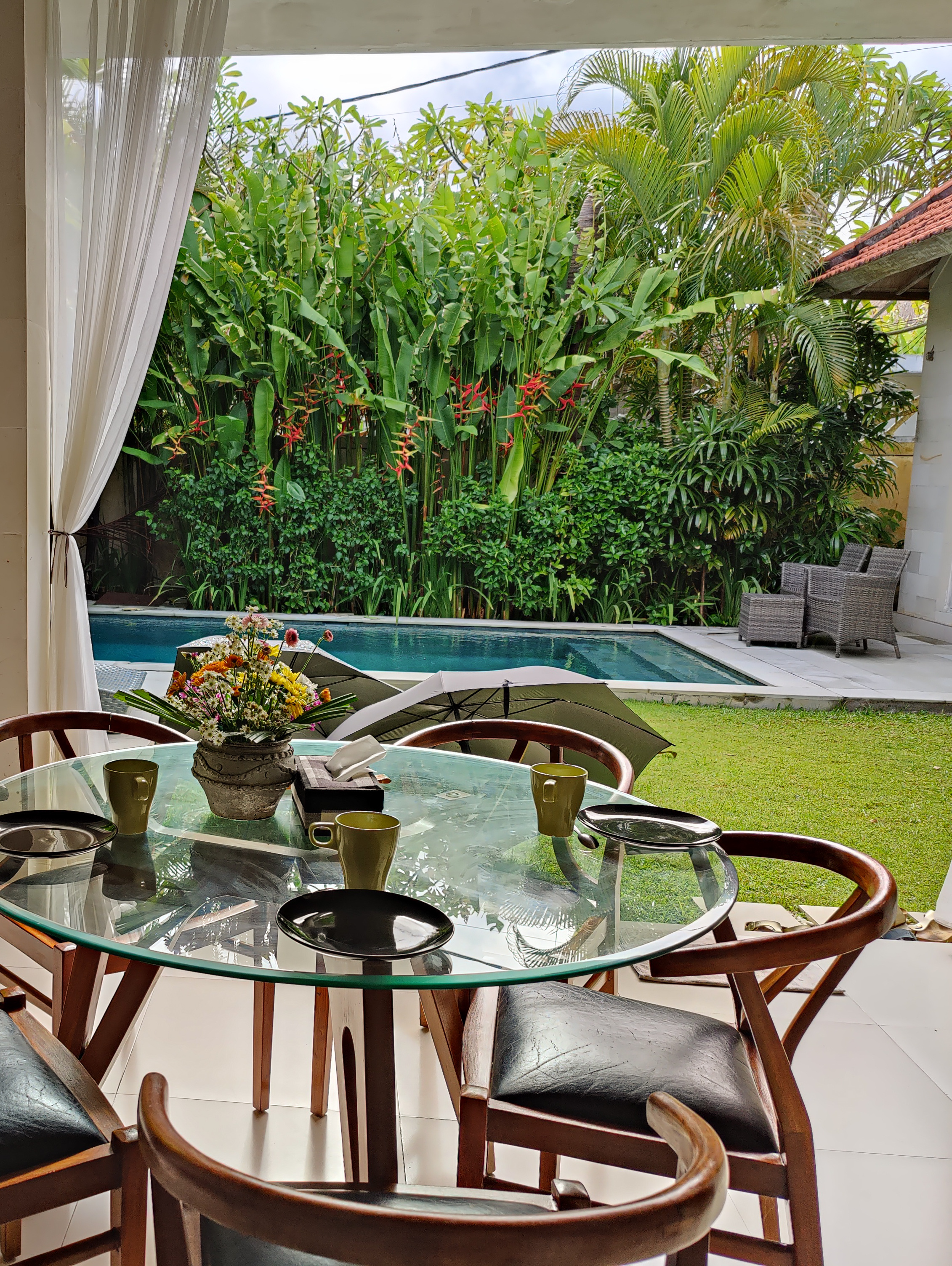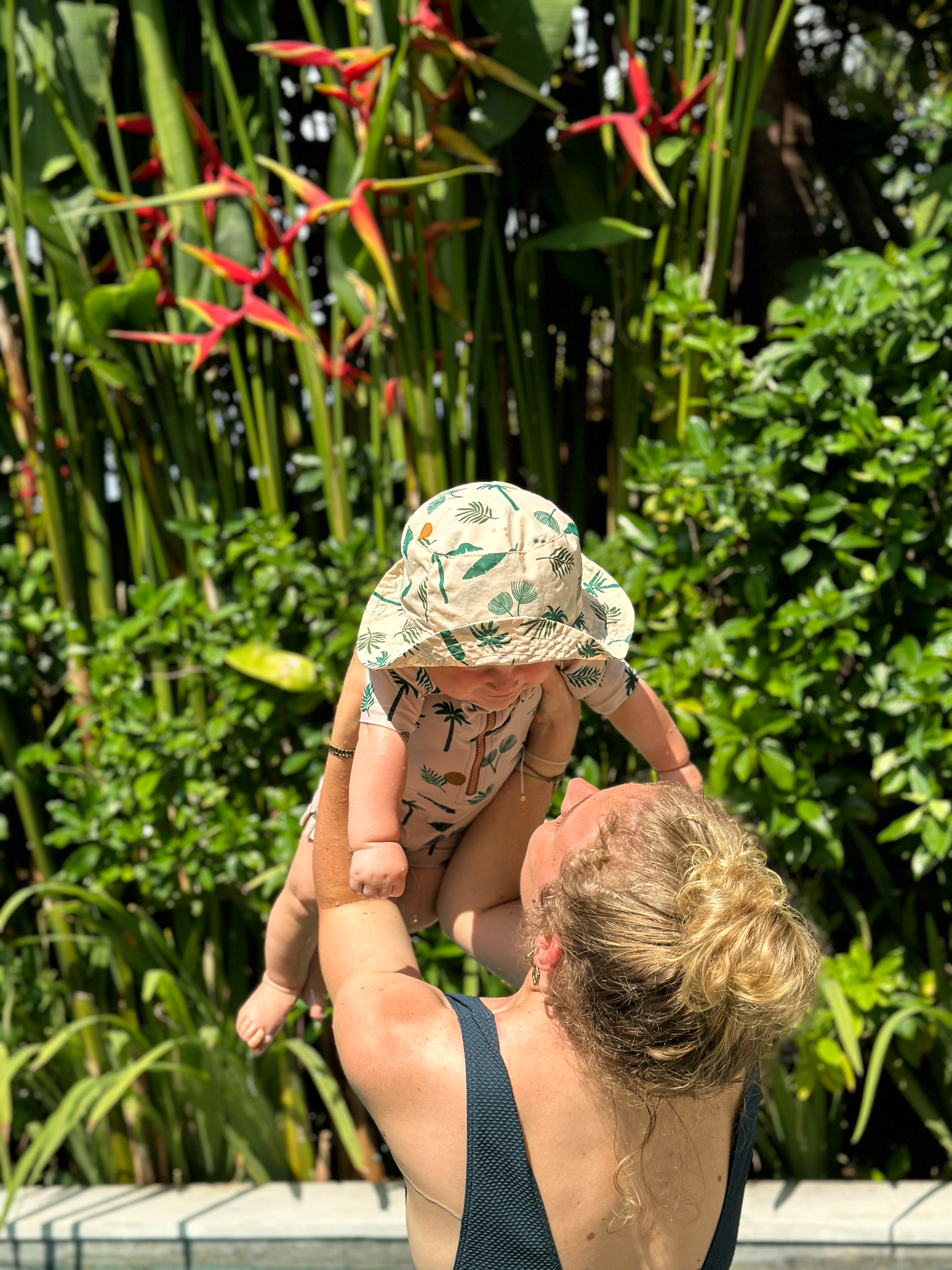 Sur place, la vie s’organise petit à petit. Les 3-4 premiers jours sont plus difficiles pour Maël. La chaleur écrasante lui tombe littéralement dessus. Posé sur le carrelage, il sue à grosses gouttes. Son corps régule peu à peu sa température. Il découvre rapidement les joies de la piscine et en profite au maximum. Les repas permettent de le caller sur le rythme balinais. Si le premier jour nous avons fait de rapides courses et tester les (étranges) purées industrielles indonésiennes, le passage au marché les jours suivants nous permet de reprendre nos habitudes avec des fruits et légumes frais. Il goûte ainsi à tous les fruits exotiques, du mangoustan au fruit du dragon en passant par le rambutan et évidemment la banane dans laquelle il croque à pleine dent. Dans la villa nous nous sentons comme à la maison : nous pouvons préparer des purées et des compotes tous les jours. Un vrai plus qui nous permet de conserver nos habitudes. Il n’est ainsi pas totalement dépaysé.