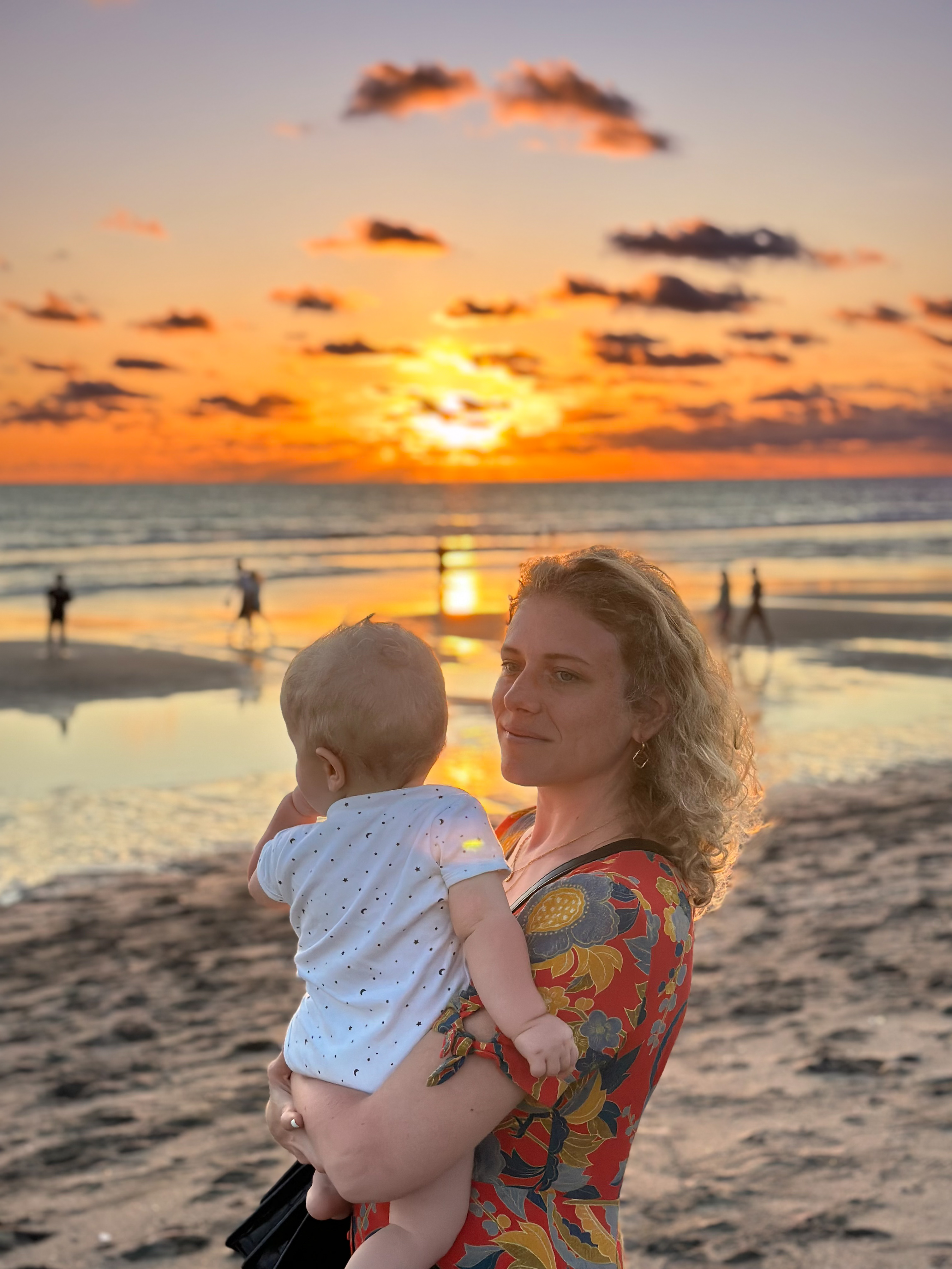 Dans la journée, nous respectons son rythme habituel : sieste du matin et de l’après-midi, temps de jeu, temps calmes. Nous avons fait le choix de ne pas nécessairement faire des activités qui nous demanderaient de prendre les transports tous les jours. Nous privilégions la découverte du quartier dans lequel nous sommes et nous nous rendons à la plage tous les soirs pour observer le coucher du soleil. Un moment magique durant lequel les températures baissent, l’air de la mer nous ravive, les couleurs dansent, les chiens jouent pour le plus grand plaisir de Maël. Un moment hors du temps, suspendu, pour graver des souvenirs indélébiles en famille.